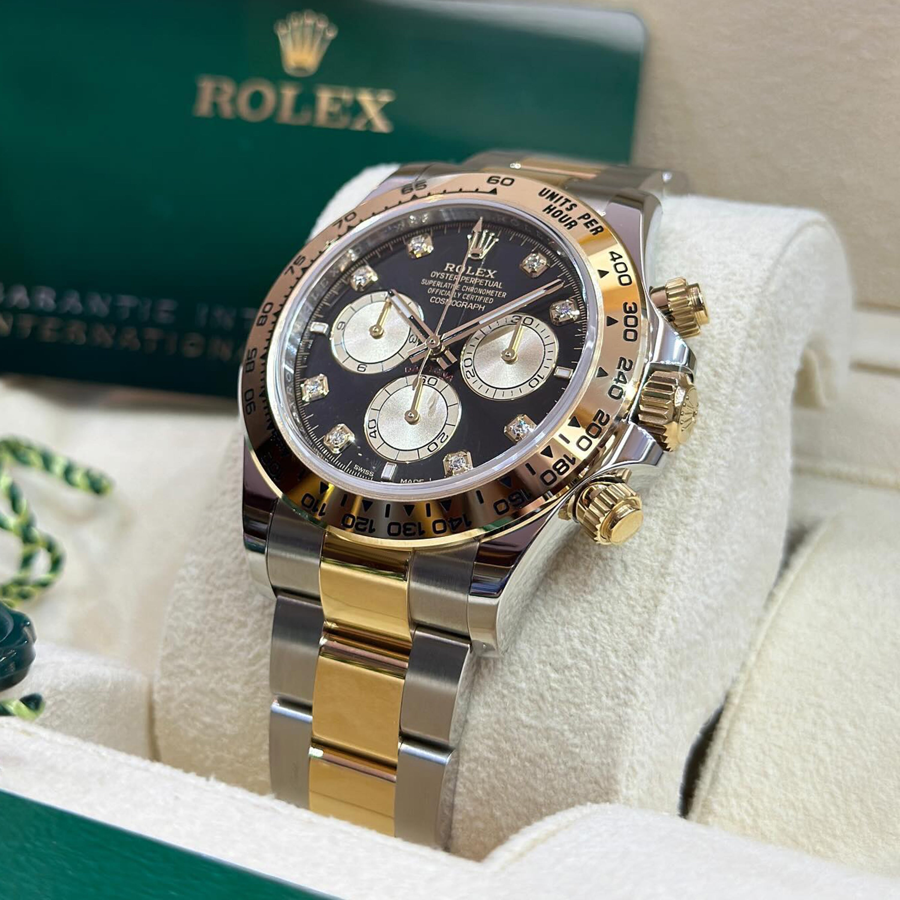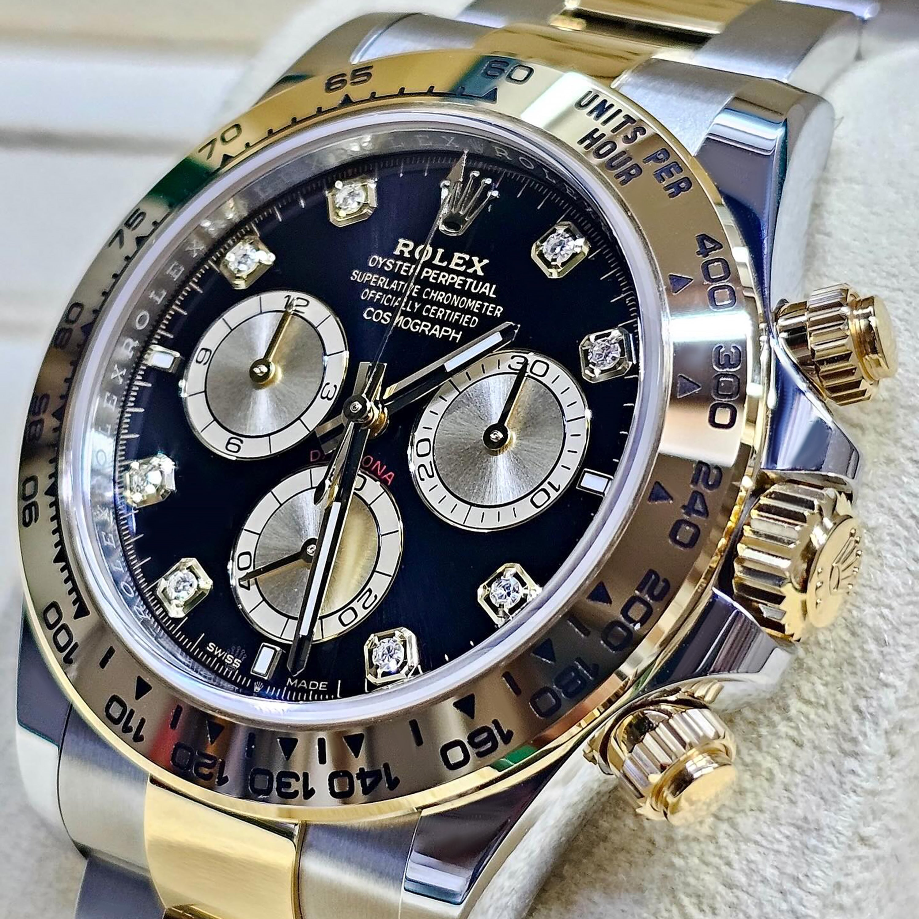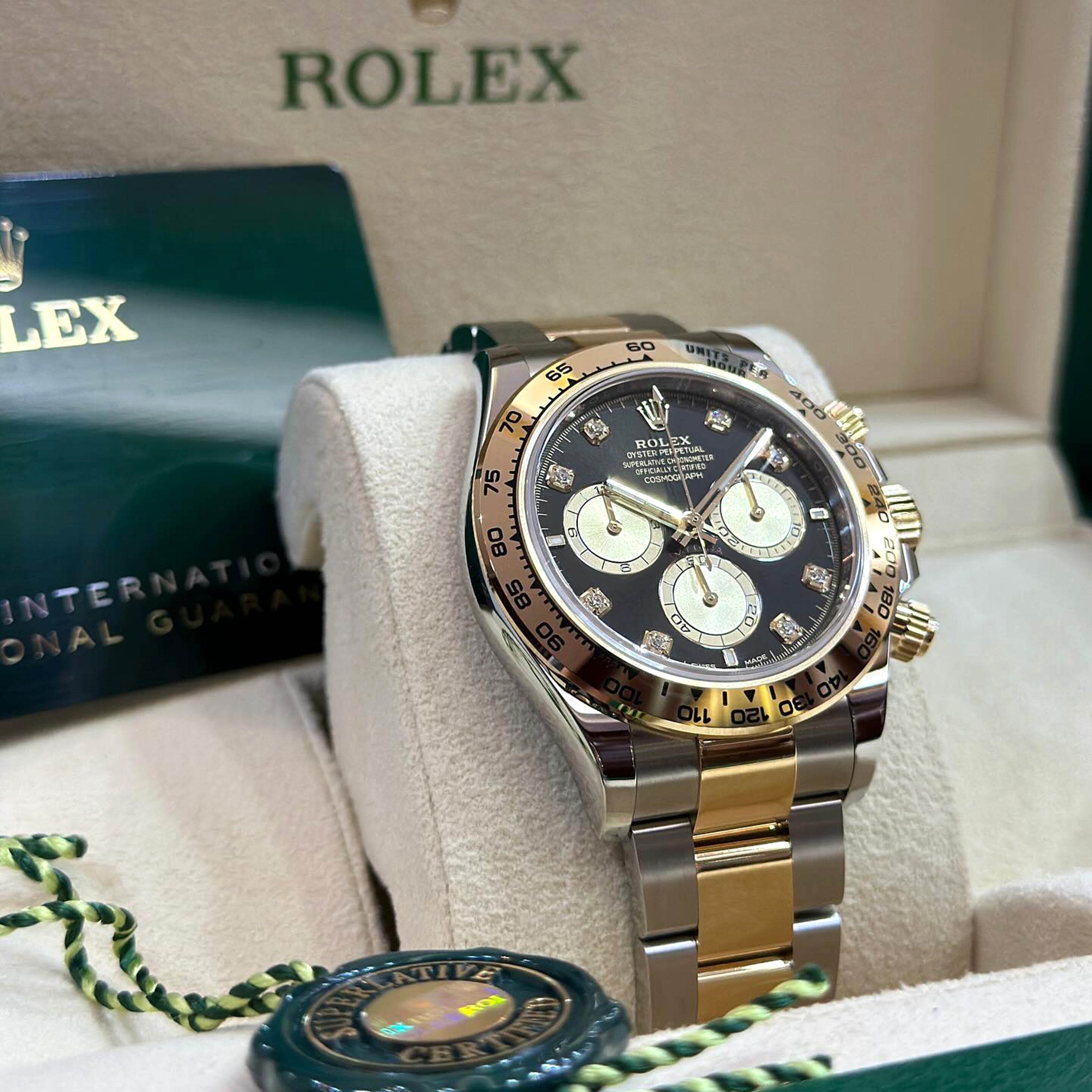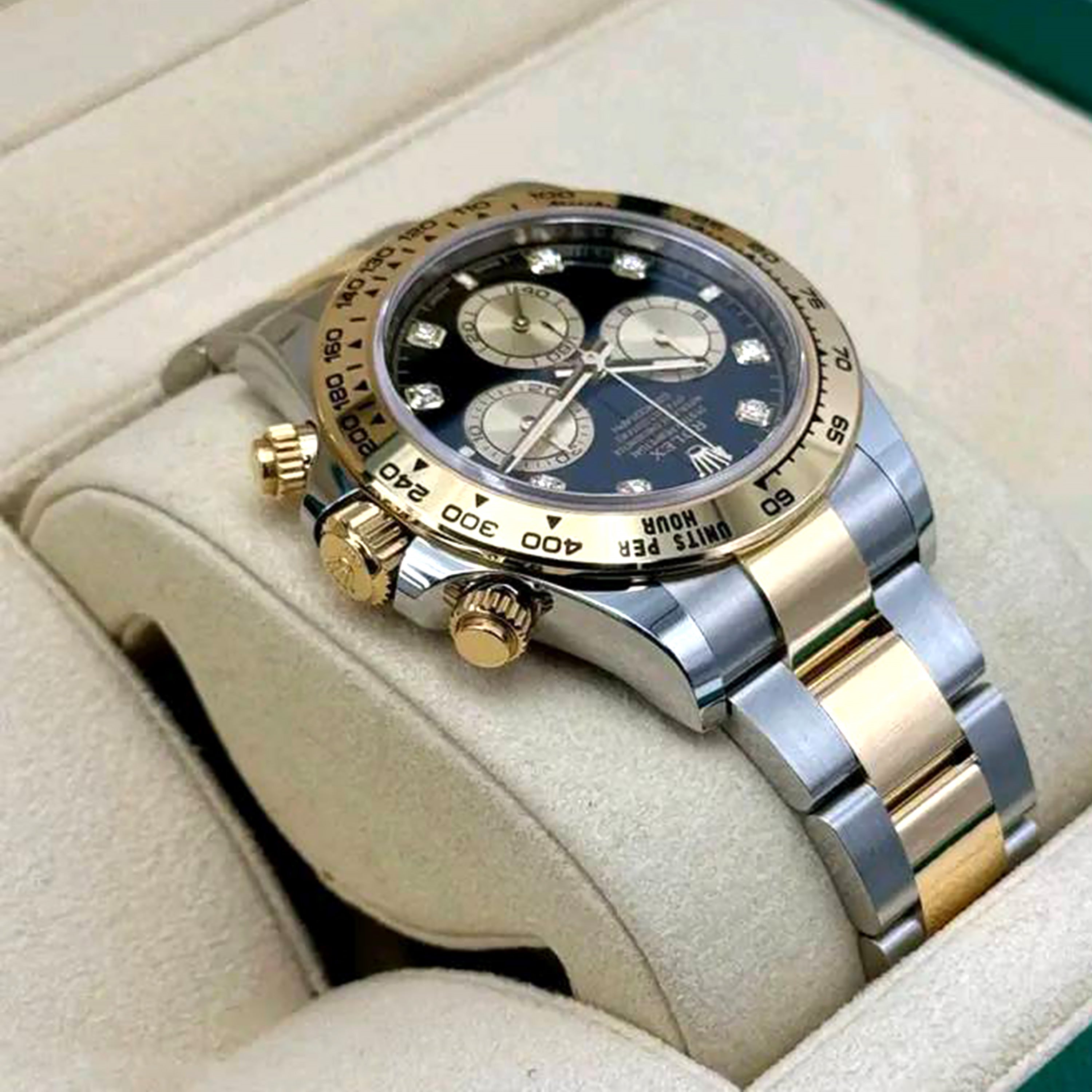 Unworn watch Rolex Cosmograph Daytona 40mm, Oystersteel and 18k Yellow Gold, Ref# 126503-0002. Born for motor racing, the watch combines sporty chic with versatility, making it a must-have for lovers of the fast lanes and the finest cars. The luxurious Rolex Cosmograph Daytona is synonymous with excellent workmanship, first-class technical features and unique looks. Proof of this is the stunning Bright black dial and the crisply readable Chromalight display with a long blue glow and stylish set with diamonds hour markers. Spiral-shaped Yellow counters complement it at 3, 6 and 9 o’clock, which record the hours, minutes and seconds from the start of the race. Elegant sword-shaped hour and minute hands are filled with high-definition luminescent material. The graceful central seconds hand allows you to count time with an accuracy of 1/8 second. All details are made of 18k Yellow gold. A well-readable minute scale is applied along the outer contour of the dial. All this charm is complemented by a ribbed, for a comfortable grip, screw-down crown in 18k Yellow Gold with the Rolex logo, which has a triple Triplock water-resistance system. At the 2 and 4 o’clock positions are the chronograph control buttons made of 18k Yellow Gold. The dial is covered with a scratch-resistant sapphire crystal and a solid Oystersteel case back. The Fixed 18k Yellow Gold monobloc bezel with engraved tachymetric scale enhances the functionality of the watch. The model is equipped with a manufacture Rolex Self-winding mechanical movement Calibre 4131, contains 47 jewels and has an approximate power reserve approximately of 72 hours. This spectacular timepiece is presented on an Oystersteel and 18k Yellow Gold Oyster, three-piece solid links bracelet. The Oystersteel and 18k Yellow Gold Folding Oysterlock safety clasp with Easylink 5 mm comfort extension link, made using own unique Rolex technologies, guarantees maximum comfort on the wrist. Water resistant up to 100m/330ft (10 ATM).