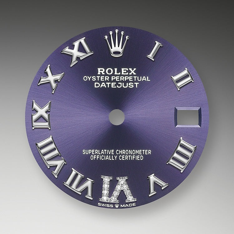 - Dial color: Aubergine dial with a fine sunray and 11 diamonds on large numeral VI, Roman Numerals as hour markers of 18k White Gold