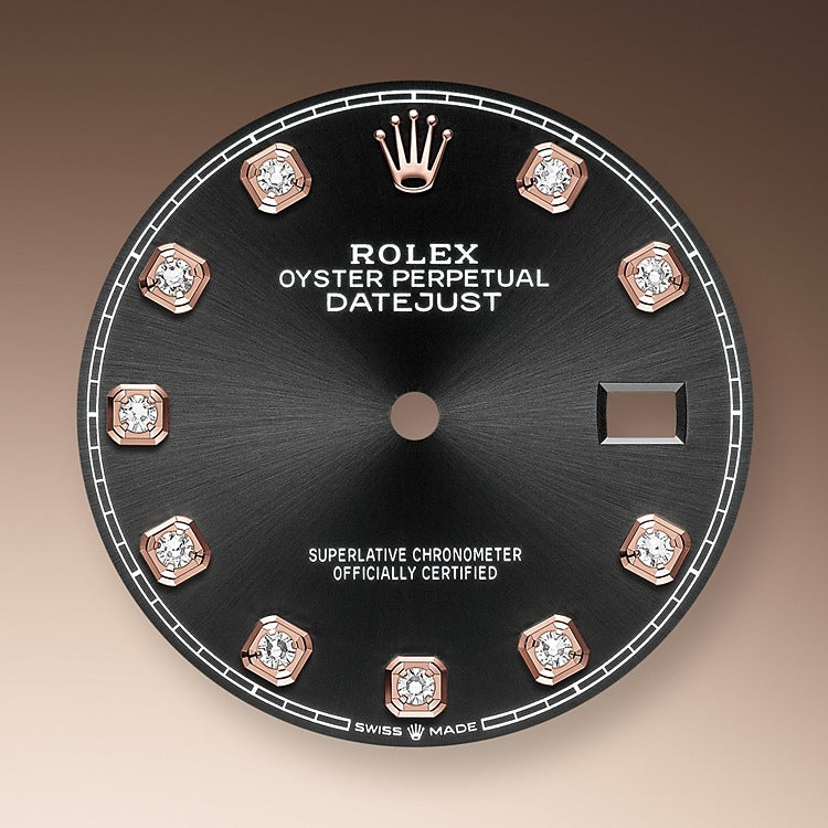 Rolex Datejust 36 watch with polished 18k Everose Gold and Stainless Steel case, Reference 126231-0019. This model has Bright black dial with a fine sunray finish. The dial is adorned Rolex Crown logo of 18k Everose Gold at the 12 o’clock position, hour markers are 10 Diamonds in 18k Everose Gold settings, and polished 18k Everose Gold hands. Date window with a “Cyclops” magnifying lens displayed at the 3 o’clock position. Polished 18k Everose Gold “Twinlock” crown, featuring two sealed zones when the crown is screwed down: the first inside the tube of the crown, the second inside the winding crown itself. The dial closed by a Scratch-resistant Sapphire Crystal and solid case back made. The watch is equipped fluted fixed polished 18k Everose Gold bezel. The watch is mechanical self-winding Manufacture Rolex 3235 contains 31 Jewels and has an approximate power reserve of 70 hours of power reserve. This model presented on Jubilee bracelet of brushed Stainless Steel outer links and polished 18k Everose Gold center links with a Folding Oysterlock safety clasp with Easylink 5 mm comfort extension link. The water resistance is up to 100m/330ft (10 ATM).