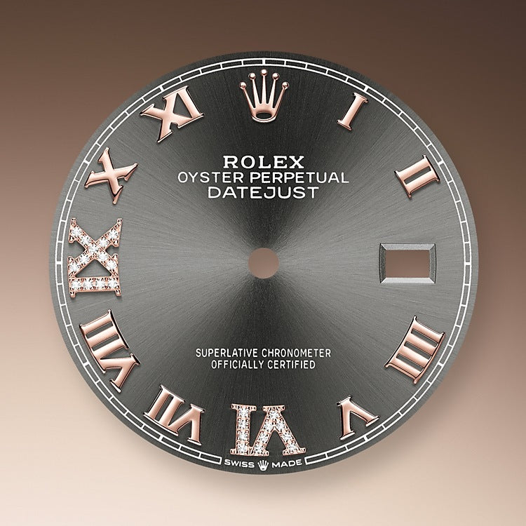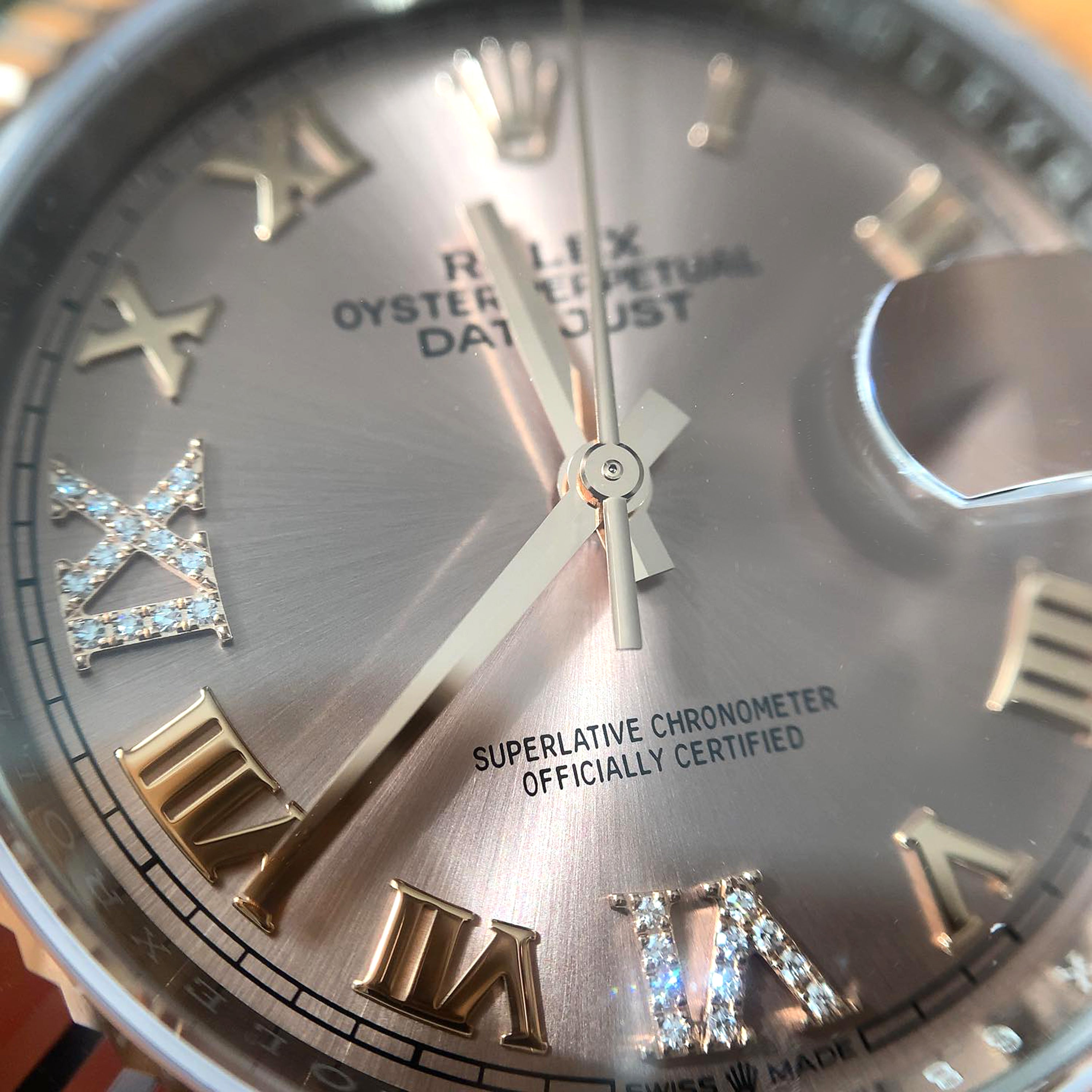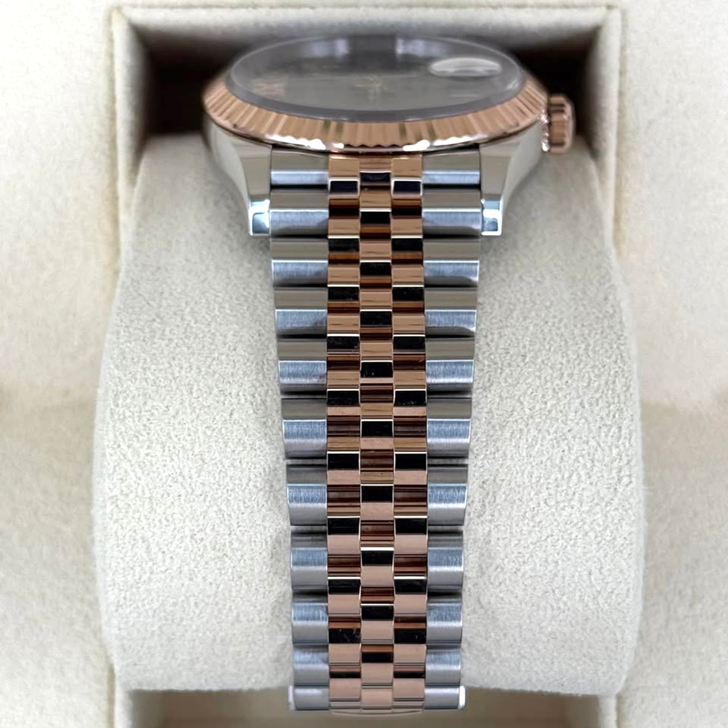 Rolex Datejust 36 watch with polished 18k Everose Gold and Stainless Steel case, Reference 126231-0023. This model has Grey ‘Dark Rhodium’ dial with a fine sunray finish. The dial is adorned applied polished 18k Everose Gold Roman numeral hour markers also VI and IX in 18k Everose gold, set with 24 diamonds and polished 18k Everose Gold hands. Fine printed minute track on teh dial perimeter. Date window with a “Cyclops” magnifying lens displayed at the 3 o’clock position. Polished 18k Everose Gold “Twinlock” crown, featuring two sealed zones when the crown is screwed down: the first inside the tube of the crown, the second inside the winding crown itself. The dial closed by a Scratch-resistant Sapphire Crystal and solid case back made. The watch is equipped fluted fixed polished 18k Everose Gold bezel. The watch is mechanical self-winding Manufacture Rolex 3235 contains 31 Jewels and has an approximate power reserve of 70 hours of power reserve. This model presented on Jubilee bracelet of brushed Stainless Steel outer links and polished 18k Everose Gold center links with a Folding Oysterlock safety clasp with Easylink 5 mm comfort extension link. The water resistance is up to 100m/330ft (10 ATM). The watch is Superlative Chronometer certified: the movement is COSC certified prior to casing, then it is tested a second time by Rolex after being cased to ensure accuracy.