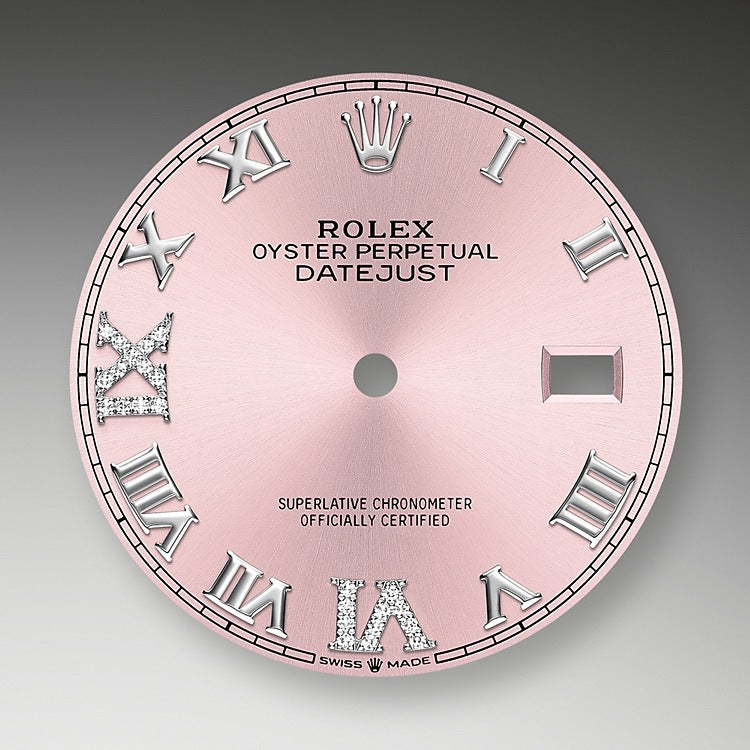 Rolex Datejust 36 watch with polished Stainless Steel and 18k White Gold case, Reference 126234-0031. This model has Pink set with diamonds dial and a fine sunray finish. The dial is adorned Rolex Crown logo of 18k White Gold at the 12 o’clock position, polished 18k White Gold hands and 18k White Gold Roman numeral hour markers also VI and IX in 18k White gold, set with 24 diamonds. Fine printed minute track on teh dial perimeter. Date window with a “Cyclops” magnifying lens displayed at the 3 o’clock position. The dial closed by a Scratch-resistant Sapphire Crystal and solid case back made. The watch is equipped fluted fixed polished 18k White Gold bezel and polished Stainless Steel “Twinlock” crown with double waterproofness system. The watch is mechanical self-winding Manufacture Rolex 3235 contains 31 Jewels and has an approximate power reserve of 70 hours of power reserve. This model presented on Jubilee bracelet of brushed outer and polished center links Stainless Steel with a Folding Oysterlock safety clasp with Easylink 5 mm comfort extension link. The water resistance is up to 100m/330ft (10 ATM). Superlative Chronometer certified: the movement is COSC certified prior to casing, then it is subjected to a rigorous second test by Rolex after casing to ensure precision of +/- 2 seconds per day, power reserve, water-resistance and self-winding.