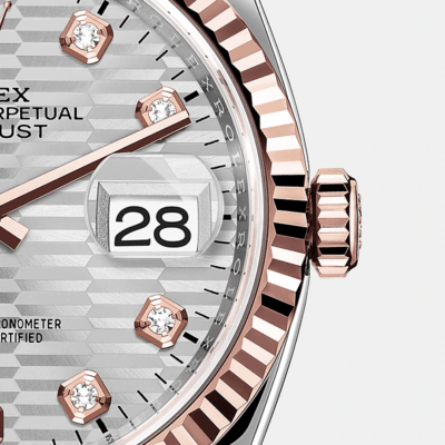 - Dial color: Silver dial with fluted motif and 10 Diamonds as hour markers framed in 18k Everose Gold