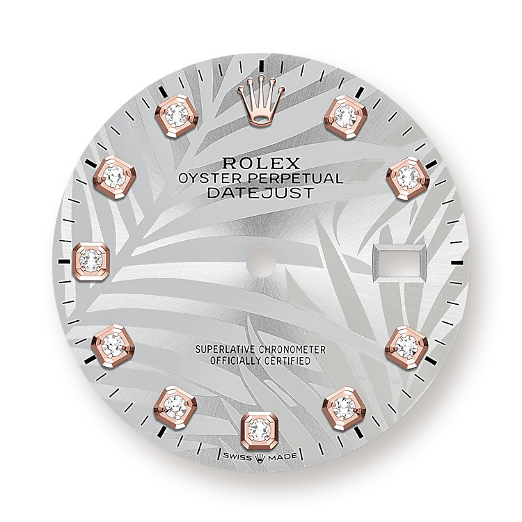 - Dial color: Silver dial with palm motif and 10 Diamonds as hour markers framed in 18k Everose Gold