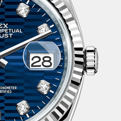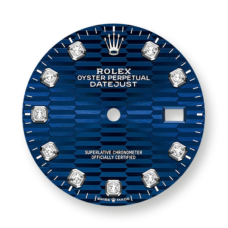 - Dial color: Bright blue dial with fluted motif and 10 Diamonds as hour markers framed in 18k White Gold