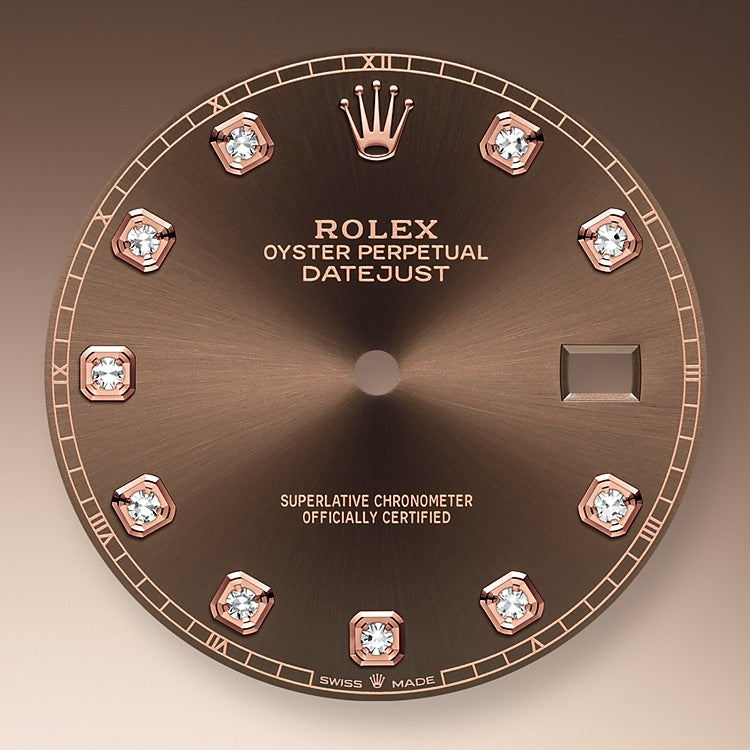 Rolex Datejust 41 watch with polished 18k Everose Gold and Stainless Steel case, Reference 126331-0004. This model has Chocolate dial with a fine sunray. The dial is adorned with polished 18k Everose Gold hands and Hour markers are 10 Diamonds in 18k Everose Gold settings. Fine printed minute track on teh dial perimeter. Moreover, every five minutes are marked with Roman numerals. Date window with a “Cyclops” magnifying lens displayed at the 3 o’clock position. Polished 18k Everose Gold “Twinlock” crown, featuring two sealed zones when the crown is screwed down: the first inside the tube of the crown, the second inside the winding crown itself. The dial closed by a Scratch-resistant Sapphire Crystal and solid case back made. The watch is equipped Fluted fixed polished 18k Everose Gold bezel. The watch is mechanical self-winding Manufacture Rolex 3235 contains 31 Jewels and has an approximate power reserve of 70 hours of power reserve. This model presented on Jubilee bracelet of brushed Stainless Steel outer links and polished 18k Everose Gold center links with a Folding Oysterlock safety clasp with Easylink 5 mm comfort extension link. The water resistance is up to 100m/330ft (10 ATM).