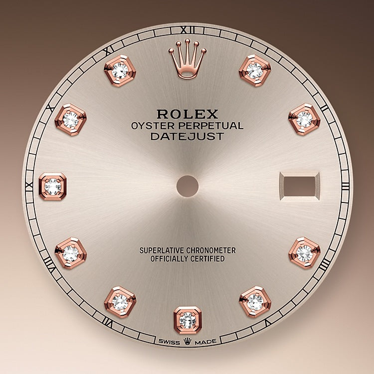 Rolex Datejust 41 watch with polished 18k Everose Gold and Stainless Steel case, Reference 126331-0008. This model has Sundust dial with a fine sunray. The dial is adorned with polished 18k Everose Gold hands and Hour markers are 10 Diamonds in 18k Everose Gold settings. Fine printed minute track on teh dial perimeter. Moreover, every five minutes are marked with Roman numerals. Date window with a “Cyclops” magnifying lens displayed at the 3 o’clock position. Polished 18k Everose Gold “Twinlock” crown, featuring two sealed zones when the crown is screwed down: the first inside the tube of the crown, the second inside the winding crown itself. The dial closed by a Scratch-resistant Sapphire Crystal and solid case back made. The watch is equipped Fluted fixed polished 18k Everose Gold bezel. The watch is mechanical self-winding Manufacture Rolex 3235 contains 31 Jewels and has an approximate power reserve of 70 hours of power reserve. This model presented on Jubilee bracelet of brushed Stainless Steel outer links and polished 18k Everose Gold center links with a Folding Oysterlock safety clasp with Easylink 5 mm comfort extension link. The water resistance is up to 100m/330ft (10 ATM).