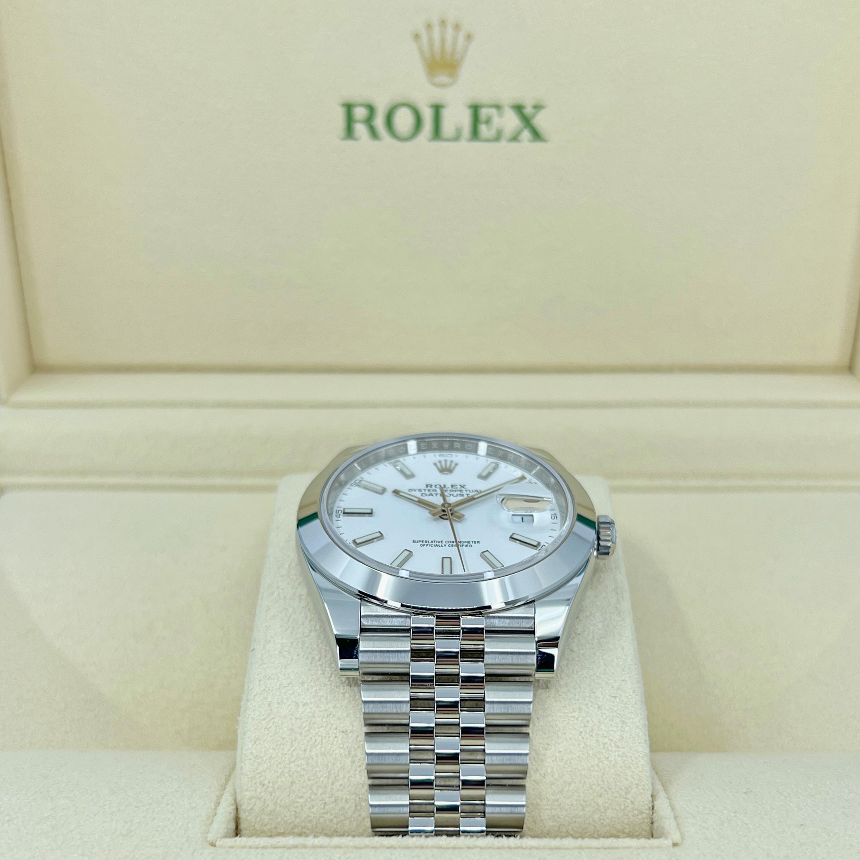 Rolex Datejust 41 watch with polished Stainless Steel case, Reference 126300-0006. This model has White dial with highly legible Chromalight display with long-lasting blue luminescence. The dial is adorned with polished hands – hour and minute hands with partial luminous fill and applied polished index hour markers with luminescent fill. Fine printed minute track on teh dial perimeter with Arabic numerals marking every 5-minute interval. Date window with a “Cyclops” magnifying lens displayed at the 3 o’clock position. Polished Stainless Steel “Twinlock” crown, featuring two sealed zones when the crown is screwed down: the first inside the tube of the crown, the second inside the winding crown itself. The dial closed by a Scratch-resistant Sapphire Crystal and solid case back made. The watch is equipped Smooth fixed polished Stainless Steel bezel. The watch is mechanical self-winding Manufacture Rolex 3235 contains 31 Jewels and has an approximate power reserve of 70 hours of power reserve. This model presented on Stainless Steel Jubilee bracelet of brushed outer links and polished center links with a Folding Oysterlock safety clasp with Easylink 5 mm comfort extension link. The water resistance is up to 100m/330ft (10 ATM).