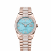 Unworn watch Rolex Day-Date 36, 18k Everose Gold with Diamond-set, 36mm, Ref# 128235-0064. New for 2023 in the Oyster Perpetual Day-Date 36, series are watches with dials made of decorative stones. Thanks to the unique crystallized effects, matrices and veins of aventurine, carnelian and turquoise, and their skillful processing, each dial turns into a unique work of art, being a worthy addition to the rest of the flawless Day-Date details. As always elegant and luxurious Day-Date 36 – is an excellent choice for people who appreciate unique beauty, high style and absolute comfort. The turquoise dial will not leave indifferent any connoisseur of beauty and sophistication. Its index hour markers and Roman numerals VI and IX in 18k Everose Gold are respectively set with 32 and 24 diamonds, using a flawless setting and leveling technique that highlights the stones’ subtle brilliance. The classic polished hands made of 18k Everose Gold look amazing on such a dial, emphasizing the sophistication of the model. The date indicator is traditionally placed at the 3 o’clock position. At the 12 o’clock, position is a semi-circular window showing the day of the week in full, providing an instantly recognizable, unique design of Day-Date. The ribbed screw-down crown in 18k Everose Gold Triplock with double watertight system, adorned with the Rolex logo, is a traditionally recognizable part of Rolex watches. The dial is covered with a scratch-resistant anti-reflective sapphire crystal and a Cyclops lens above the date with double anti-reflective coating. A solid 18k Everose Gold screw-down case back with fine fluted edges, closes the movement. The fluted fixed 18k Everose Gold bezel is not only an aesthetic element of this watch, but also a true hallmark of Rolex. The in-house Rolex mechanical movement, caliber 3255, contains 31 jewels and has an approximate power reserve of approximately 70 hours powers. This delightful timepiece is presented on an 18k Everose Gold President bracelet with semi-circular 3-piece links for flawless beauty. It features Rolex’s original concealed folding Crownclasp to secure the watch on your wrist. Water resistant up to 100m/330ft (10 ATM).