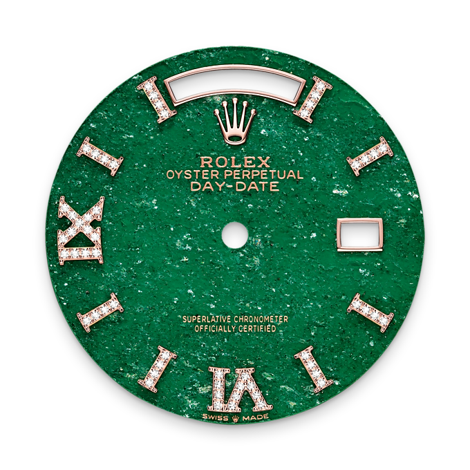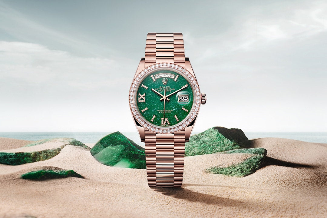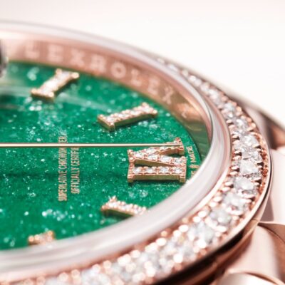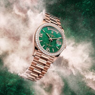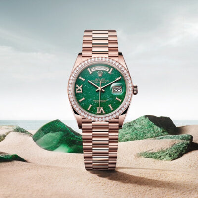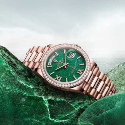 Unworn watch Rolex Day-Date 36, 18k Everose Gold, 36mm, Ref# 128345rbr-0068. New for 2023 in the Oyster Perpetual Day-Date 36, series are watches with dials made of decorative stones. Thanks to the unique crystallized effects, matrices and veins of aventurine, carnelian and turquoise, and their skillful processing, each dial turns into a unique work of art, being a worthy addition to the rest of the flawless Day-Date details. As always elegant and luxurious Day-Date 36 – is an excellent choice for people who appreciate unique beauty, high style and absolute comfort. The Green Aventurine dial will not leave indifferent any connoisseur of beauty and sophistication. Its index hour markers and Roman numerals VI and IX in 18k Everose Gold are respectively set with 32 and 24 diamonds, using a flawless setting and leveling technique that highlights the stones’ subtle brilliance. The classic polished hands made of 18k Everose Gold look amazing on such a dial, emphasizing the sophistication of the model. The date indicator is traditionally placed at the 3 o’clock position. At the 12 o’clock, position is a semi-circular window showing the day of the week in full, providing an instantly recognizable, unique design of Day-Date. The ribbed screw-down crown in 18k Everose Gold Triplock with double watertight system, adorned with the Rolex logo, is a traditionally recognizable part of Rolex watches. The dial is covered with a scratch-resistant anti-reflective sapphire crystal and a Cyclops lens above the date with double anti-reflective coating. A solid 18k Everose Gold screw-down case back with fine fluted edges, closes the movement. Fixed 18k Everose Gold bezel set with 52 brilliant-cut diamonds – sparkling a symphony that will adorn the watch and enchant its owner. The in-house Rolex mechanical movement, caliber 3255, contains 31 jewels and has an approximate power reserve of approximately 70 hours powers. This delightful timepiece is presented on an 18k Everose Gold President bracelet with semi-circular 3-piece links for flawless beauty. It features Rolex’s original concealed folding Crownclasp to secure the watch on your wrist. Water resistant up to 100m/330ft (10 ATM).