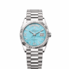 Unworn watch Rolex Day-Date 36, 18k White Gold, 36mm, Ref# 128239-0045. New for 2023 in the Oyster Perpetual Day-Date 36, series are watches with dials made of decorative stones. Thanks to the unique crystallized effects, matrices and veins of aventurine, carnelian and turquoise, and their skillful processing, each dial turns into a unique work of art, being a worthy addition to the rest of the flawless Day-Date details. As always elegant and luxurious Day-Date 36 – is an excellent choice for people who appreciate unique beauty, high style and absolute comfort. The turquoise dial will not leave indifferent any connoisseur of beauty and sophistication. Its index hour markers and Roman numerals VI and IX in 18k White Gold are respectively set with 32 and 24 diamonds, , using a flawless setting and leveling technique that highlights the stones’ subtle brilliance. The classic polished hands made of 18k White Gold look amazing on such a dial, emphasizing the sophistication of the model. The date indicator is traditionally placed at the 3 o’clock position. At the 12 o’clock, position is a semi-circular window showing the day of the week in full, providing an instantly recognizable, unique design of Day-Date. The ribbed screw-down crown in 18k White Gold Triplock with double watertight system, adorned with the Rolex logo, is a traditionally recognizable part of Rolex watches. The dial is covered with a scratch-resistant anti-reflective sapphire crystal and a Cyclops lens above the date with double anti-reflective coating. A solid 18k White Gold screw-down case back with fine fluted edges, closes the movement. The fluted fixed 18k White Gold bezel is not only an aesthetic element of this watch, but also a true hallmark of Rolex. The in-house Rolex mechanical movement, caliber 3255, contains 31 jewels and has an approximate power reserve of approximately 70 hours powers. This delightful timepiece is presented on an 18k White Gold Diamond-set President bracelet with semi-circular 3-piece links for flawless beauty. It features Rolex’s original concealed folding Crownclasp to secure the watch on your wrist. Water resistant up to 100m/330ft (10 ATM).