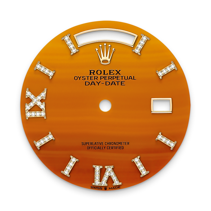 Unworn watch Rolex  Day-Date 36, 18k Yellow Gold, 36mm, Ref# 128348rbr-0050. New for 2023 in the Oyster Perpetual Day-Date 36, series are watches with dials made of decorative stones. Thanks to the unique crystallized effects, matrices and veins of aventurine, carnelian and turquoise, and their skillful processing, each dial turns into a unique work of art, being a worthy addition to the rest of the flawless Day-Date details. As always elegant and luxurious Day-Date 36 – is an excellent choice for people who appreciate unique beauty, high style and absolute comfort. The dial is carved from Carnelian, an orange-colored stone characterized by lines of various shapes and sizes, forming an intricate cameo of patterns. Its index hour markers and Roman numerals VI and IX in 18k Yellow Gold are respectively set with 32 and 24 diamonds, using a flawless setting and leveling technique that highlights the stones’ subtle brilliance. The classic polished hands made of 18k Yellow Gold look amazing on such a dial, emphasizing the sophistication of the model. The date indicator is traditionally placed at the 3 o’clock position. At the 12 o’clock, position is a semi-circular window showing the day of the week in full, providing an instantly recognizable, unique design of Day-Date. The ribbed screw-down crown in 18k Yellow Gold Triplock with double watertight system, adorned with the Rolex logo, is a traditionally recognizable part of Rolex watches. The dial is covered with a scratch-resistant anti-reflective sapphire crystal and a Cyclops lens above the date with double anti-reflective coating. A solid 18k Yellow Gold screw-down case back with fine fluted edges, closes the movement. Fixed 18k Yellow Gold bezel set with 52 brilliant-cut diamonds – sparkling a symphony that will adorn the watch and enchant its owner. The in-house Rolex mechanical movement, caliber 3255, contains 31 jewels and has an approximate power reserve of approximately 70 hours powers. This delightful timepiece is presented on an 18k Yellow Gold Diamond-set President bracelet with semi-circular 3-piece links for flawless beauty. It features Rolex’s original concealed folding Crownclasp to secure the watch on your wrist. Water resistant up to 100m/330ft (10 ATM).