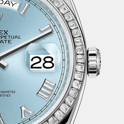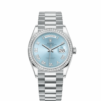 Unworn classic Rolex Day-Date, 36mm, Platinum and Diamonds, Ref# 128396tbr-0002 – luxury, elegance and practicality.