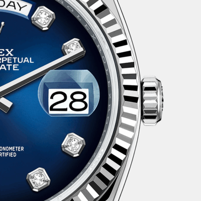 - Dial color: Blue ombré dial with a 10 Diamonds as hour markers framed in 18k White Gold, 2 of which are baguette-cut at 6 and 9 o’clock