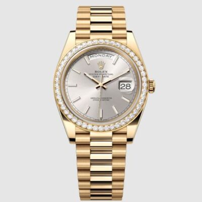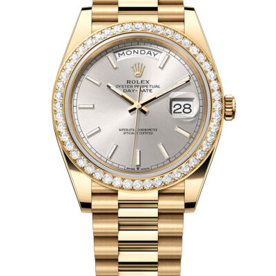 Unworn watch Rolex Day-Date 36, 18k Yellow Gold with Diamond-set, 40mm, Ref# 228348rbr-0042. Prestigious Day-Date watches remain at the cutting edge of modernity, despite the many decades passing by. As always elegant and luxurious, they are an excellent choice for people who value unique beauty, high style and absolute comfort. New for 2023 in the Rolex Day-Date 40 line is a model with a Silver dial sunray finish creates delicate light, with highly legible Chromalight display with long-lasting blue luminescence. Its classic polished index hour markers and hands made of 18k Yellow Gold with lumins fill look amazing on such a dial, emphasizing the sophistication of the model. The date indicator is traditionally placed at the 3 o’clock position. At the 12 o’clock, position is a semi-circular window showing the day of the week in full, providing an instantly recognizable, unique design of Day-Date. The ribbed screw-down crown in 18k Yellow Gold Triplock with double watertight system, adorned with the Rolex logo, is a traditionally recognizable part of Rolex watches. The dial is covered with a scratch-resistant anti-reflective sapphire crystal and a Cyclops lens above the date with double anti-reflective coating. A solid 18k Yellow Gold screw-down case back with fine fluted edges, closes the movement. The fixed polished 18k Yellow Gold bezel set with 48 diamonds, a chic element that gives the watch a unique brilliance. The in-house Rolex mechanical movement, caliber 3255, contains 31 jewels and has an approximate power reserve of approximately 70 hours powers. This delightful timepiece is presented on an 18k Yellow Gold President bracelet with semi-circular 3-piece links for flawless beauty. It features Rolex’s original concealed folding Crownclasp to secure the watch on your wrist. Water resistant up to 100m/330ft (10 ATM).