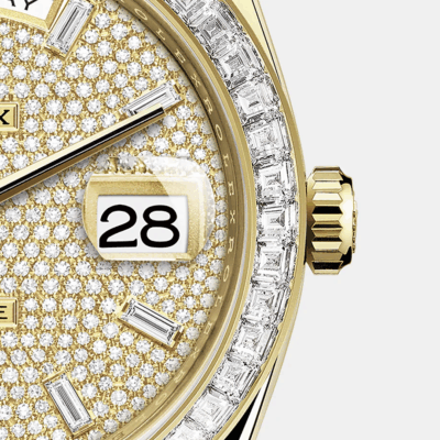 - Dial color: Diamond-paved dial with 10 baguette-cut diamonds as hour markers framed in 18k Yellow Gold