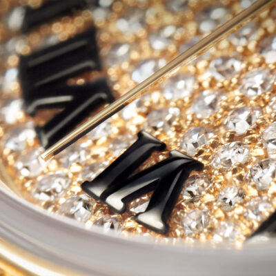 - Dial color: Diamond-paved dial set with 291 diamonds and a applied polished black Roman numerals as hour markers