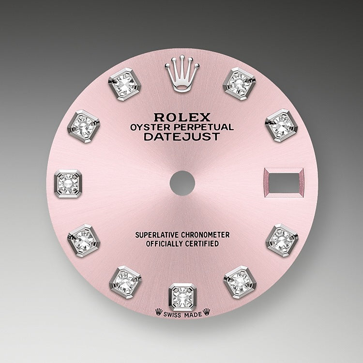- Dial color: Pink dial with a fine sunrays and 10 Diamonds as hour markers framed in 18k White Gold