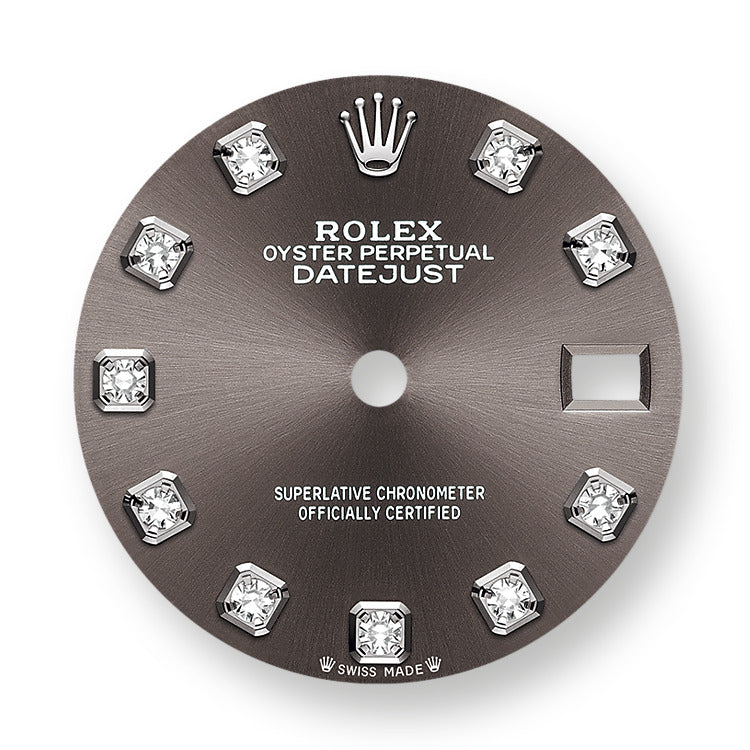 - Dial color: Dark grey dial with a fine sunrays and a 10 Diamonds as hour markers framed in 18k White Gold