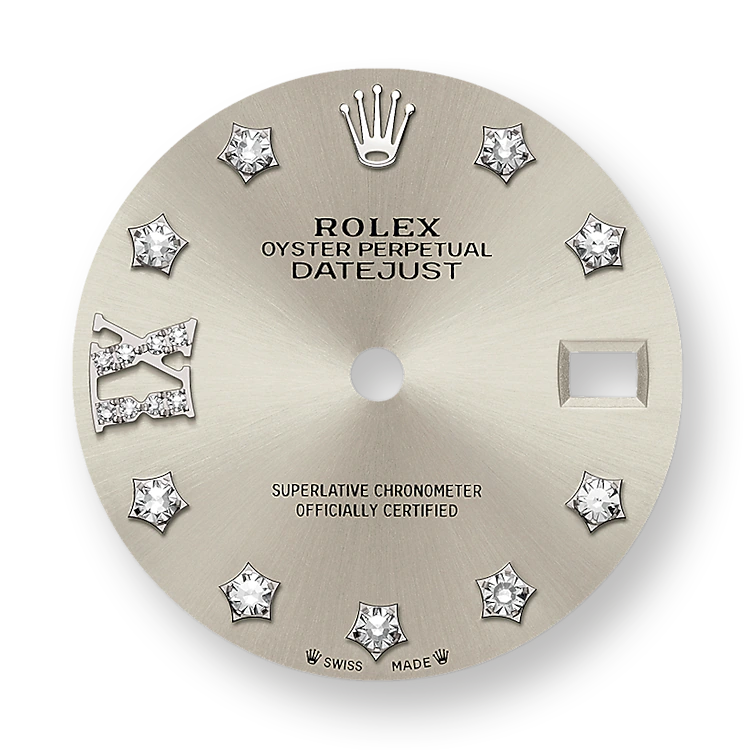- Dial color: Silver dial with a fine sunrays and Nine diamonds set in star-shaped framed in 18k White Gold settings and 8 diamonds set in Roman numeral IX framed in 18k White Gold