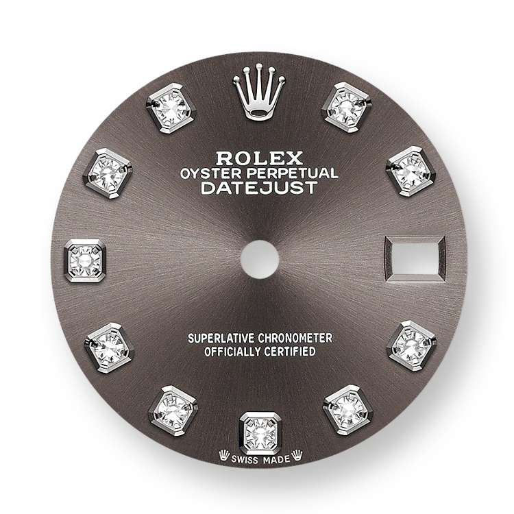 - Dial color: Dark grey dial with a fine sunrays and a 10 Diamonds as hour markers framed in 18k White Gold