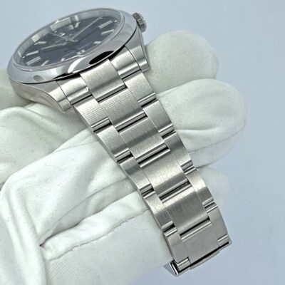 Unworn watch Rolex Oyster Perpetual No Date, Brushed Stainless Steel case with polished finished sides 41mm. This model has Bright black dial with highly legible Chromalight display with long-lasting blue luminescence with a fine sunray finish. Applied polished index hour markers with luminous fill. Polished hands, hour and minute hands with luminous fill. Fine printed minute/seconds and fractions of a second track on teh dial perimeter. Moreover, every five minutes are marked with a luminous dot. Polished Stainless Steel screw-down crown with Rolex’s patented “Triplock” triple waterproofness system, ensuring that the crown screws down against the Oyster case as securely as a submarine hatch. The dial closed by a Scratch-resistant Sapphire Crystal and solid case back made. The watch is equipped domed fixed polished silver-tone Stainless Steel bezel. The watch is mechanical self-winding Manufacture Rolex 3230 contains 31 Jewels and has an approximate power reserve of 70 running the time only. This model presented on Brushed Stainless Steel Oyster bracelet with flat three-piece links and a Folding Oysterlock safety clasp with Easylink 5 mm comfort extension link. The water resistance is up to 100m/330ft (10 ATM).