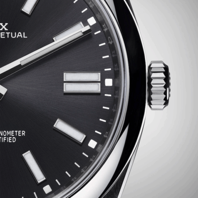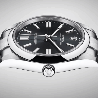 Rolex Oyster Perpetual No Date, Brushed Stainless Steel case with polished finished sides 41mm watch. This model has Bright black dial with highly legible Chromalight display with long-lasting blue luminescence with a fine sunray finish. Applied polished index hour markers with luminous fill. Polished hands, hour and minute hands with luminous fill. Fine printed minute/seconds and fractions of a second track on teh dial perimeter. Moreover, every five minutes are marked with a luminous dot. Polished Stainless Steel screw-down crown with Rolex’s patented “Triplock” triple waterproofness system, ensuring that the crown screws down against the Oyster case as securely as a submarine hatch. The dial closed by a Scratch-resistant Sapphire Crystal and solid case back made. The watch is equipped domed fixed polished silver-tone Stainless Steel bezel. The watch is mechanical self-winding Manufacture Rolex 3230 contains 31 Jewels and has an approximate power reserve of 70 running the time only. This model presented on Brushed Stainless Steel Oyster bracelet with flat three-piece links and a Folding Oysterlock safety clasp with Easylink 5 mm comfort extension link. The water resistance is up to 100m/330ft (10 ATM).