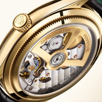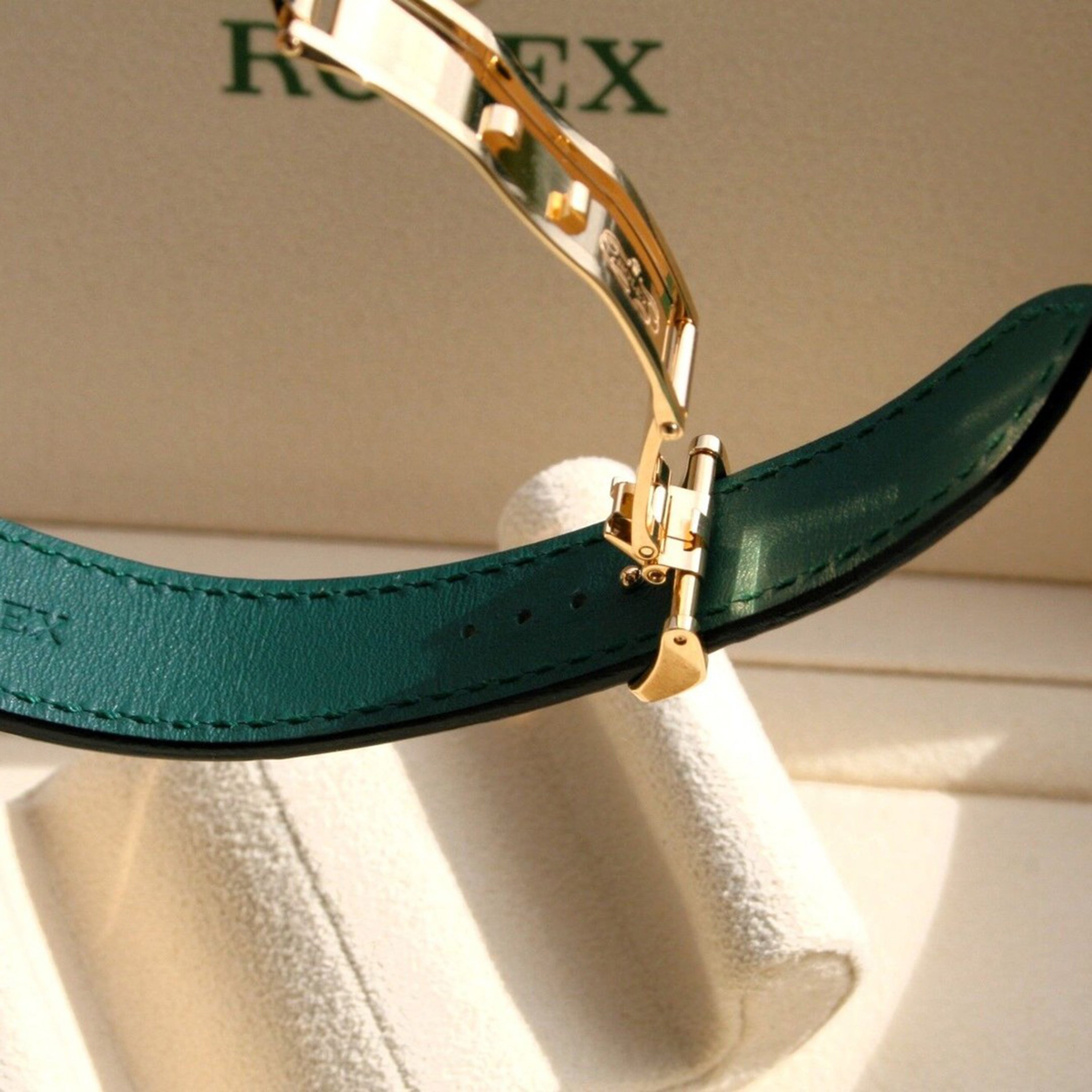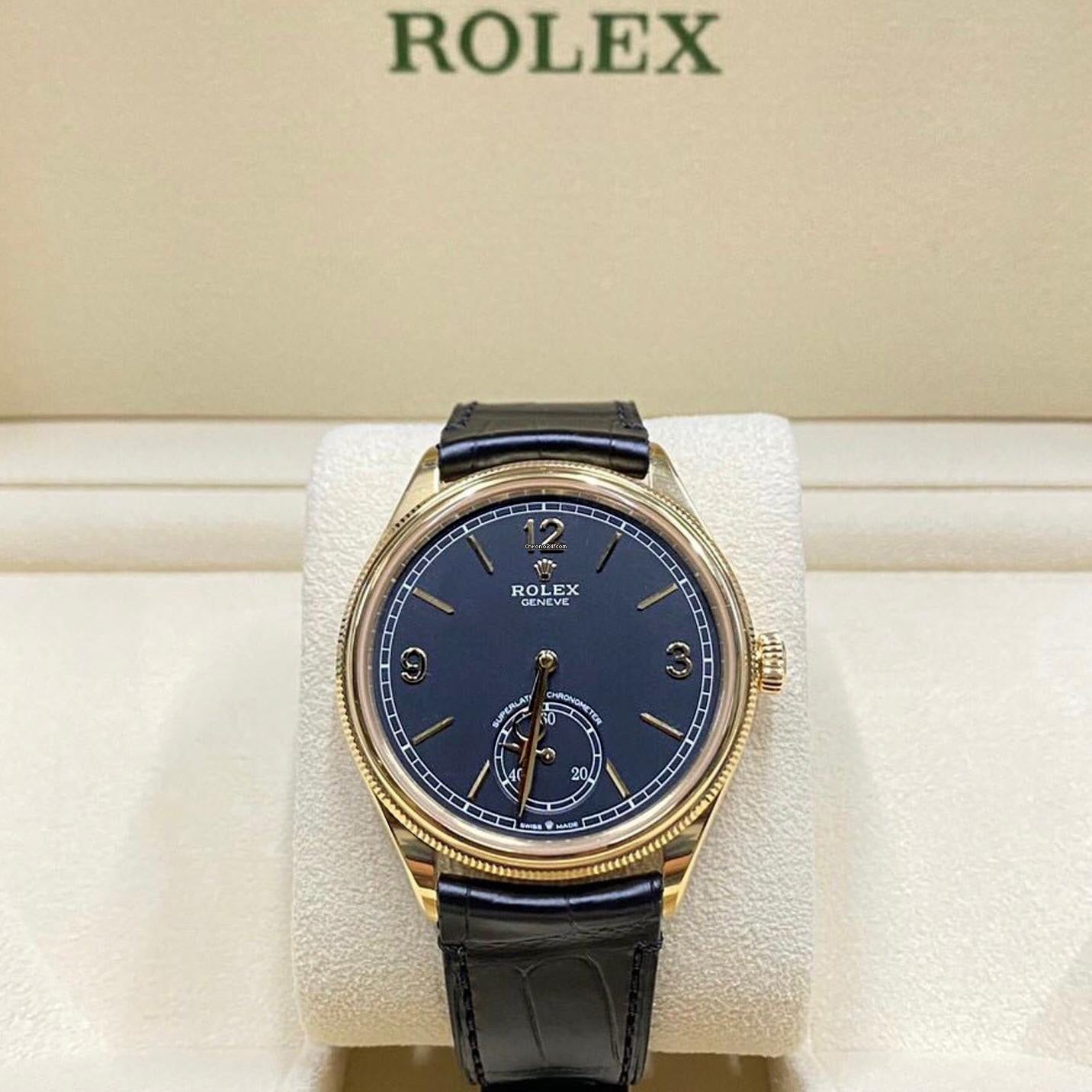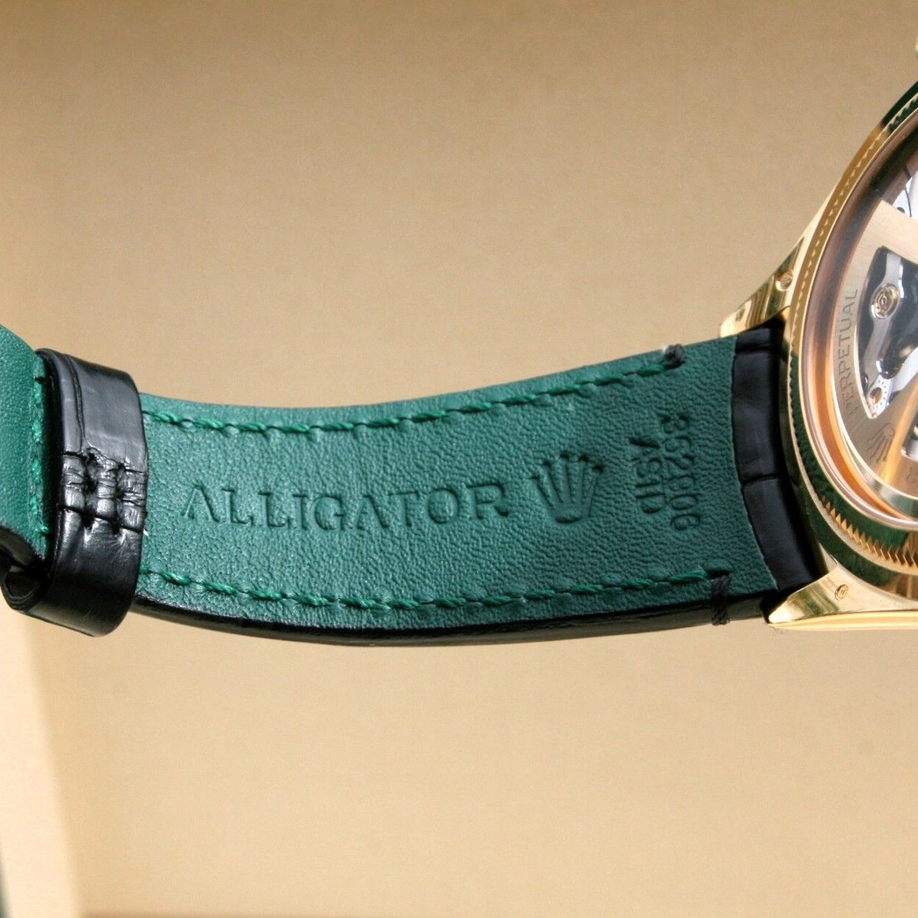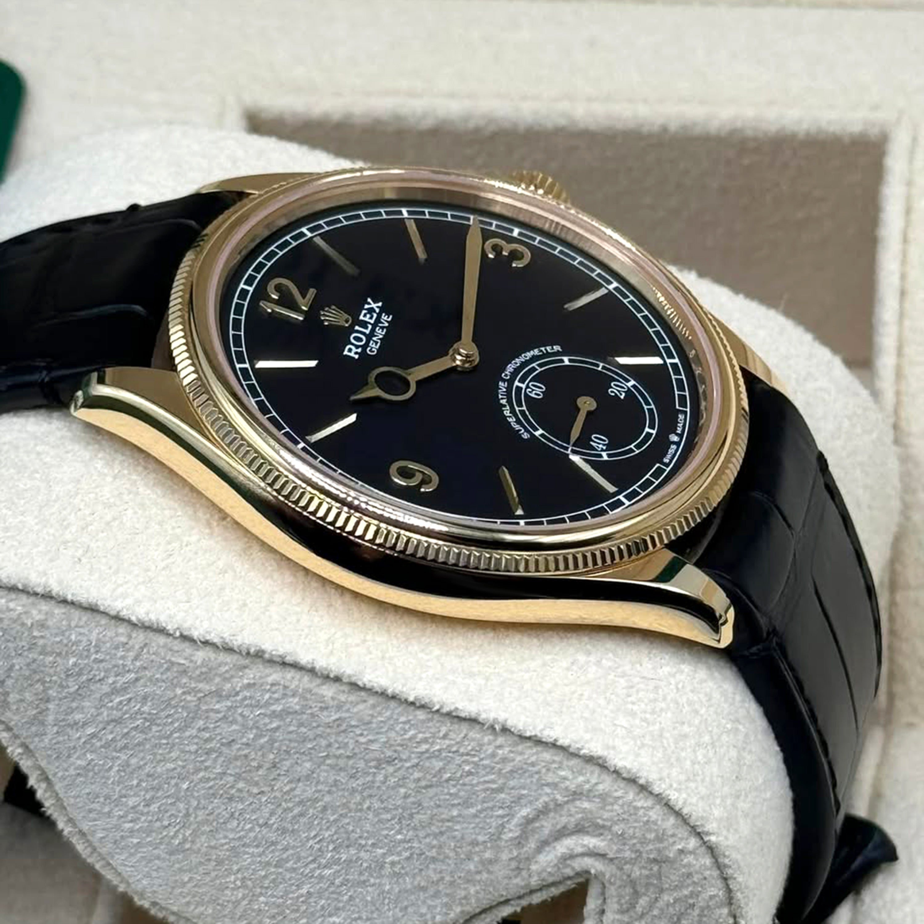 Unworn watch Rolex Perpetual 1908, 39mm, 18k Yellow Gold, Ref# 52508-0002. Striving for the highest level of quality to achieve flawless, long-lasting results is the life philosophy of Rolex. It is in this vein that the global brand has developed a classic collection of watches with a new name and a new look, modestly dressy, ideal for a business suit – Rolex Perpetual 1908. Paying homage to the year in which the “Rolex” lettering first appeared on the dials, the entire Perpetual 1908 model inspired by the watchmaker’s first creation to feature a self-winding rotor. Proof of this is the stunning Intense Black dial with superbly long and narrow 18k Yellow Gold applied indexes and Arabic numerals at 12, 3 and 9 o’clock. At 6 o’clock is a small second’s dial, sportier than you might expect, with 20, 40 and 60 on the track. An elegant sword-shaped minute hand with a classic hour hand marked with a ring at the tip, made of 18k Yellow Gold. A well-readable minute scale is applied along the outer contour of the dial. All this charm is complemented by a ribbed, for a comfortable grip, domed screw-down crown in 18k Yellow Gold with the Rolex logo. The dial is covered with a scratch-resistant sapphire crystal. The highlight of the model is the two-tiered 18k Yellow Gold bezel with a convex and tactile upper part and a characteristic grooved lower part. The model is powered by the in-house automatic Rolex mechanical movement caliber 7140, new 2023, contains 38 jewels and has an approximate power reserve of approximately 66 hours. The mesmerizing work of the mechanism can be seen through the transparent case back. This impressive watch is presented on a matt black alligator leather strap with green lining and tone-on-tone stitching, custom made for this model. It is fitted with an 18k Yellow Gold Dualclasp folding clasp. Thanks to its carefully shaped design, the Dualclasp is always centered on the wrist for maximum comfort. Water resistant up to 50m/165ft (5 ATM).