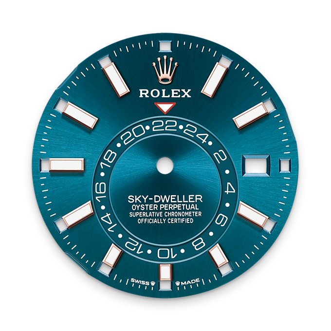 Unworn watch Rolex Sky-Dweller, 42mm, 18k Everose Gold, Ref# 336935-0001. New for 2023, a true masterpiece of engineering. Elegant and versatile, this stunning timepiece is the perfect luxury accessory for the modern traveler. This superb chronometer features an Blue-green dial, which is the perfect backdrop for the luminous 18k Everose Gold index hour markers and hands, making it easy to read the time even in low light conditions. A well-readable minute scale is applied along the outer contour of the dial. The sophisticated multi-function display makes it easy to keep track of the time in two different time zones. The reference time is displayed in 24-hour format on an off-center dial, while the local time is read using the normal central hands. The annual calendar, named Saros, is powered by a patented mechanism and features an innovative display: the months of the year are shown in 12 windows around the circumference of the dial, behind the hour marker – the current month is displayed in red. The instantaneous date change is related to local time. The ribbed, easy-to-grip Triplock 18k Everose Gold screw-down crown features a triple water-resistance system in and Rolex logo decorated. The dial is covered with a scratch-resistant sapphire crystal with anti-reflective coating and Cyclops lens at the 3 o’clock position. The fluted bezel in 18k Everose Gold is a true hallmark of Rolex. Bidirectional rotatable, it is part of the Ring Command system and, when interacting with the crown, allows the user to select watch functions one by one and adjust them easily, quickly and simply. The model is powered by the innovative in-house Rolex mechanical movement, caliber 9002, contains 29 jewels and has an approximate power reserve of approximately 72 hours. This delightful timepiece is presented on an Oyster bracelet with one-piece three-piece links in 18k Everose Gold. Thanks to the new hidden fastening system under the bezel, there is a perfect visual continuity between the bracelet and the case. The bracelet features an 18k Everose Gold Oysterclasp folding clasp with Rolex’s original Easylink patented quick extension system of approximately 5mm for added comfort in all circumstances. Water resistant up to 100m/330ft (10 ATM).