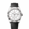 Unworn watch Rolex Sky-Dweller, 42mm, 18k Yellow Gold, Ref# 336238-0003. New for 2023, a true masterpiece of engineering. Elegant and versatile, this stunning timepiece is the perfect luxury accessory for the modern traveler. This superb chronometer features an Intense white dial, which is the perfect backdrop for the luminous 18k Yellow Gold index hour markers and hands, making it easy to read the time even in low light conditions. A well-readable minute scale is applied along the outer contour of the dial. The sophisticated multi-function display makes it easy to keep track of the time in two different time zones. The reference time is displayed in 24-hour format on an off-center dial, while the local time is read using the normal central hands. The annual calendar, named Saros, is powered by a patented mechanism and features an innovative display: the months of the year are shown in 12 windows around the circumference of the dial, behind the hour marker – the current month is displayed in red. The instantaneous date change is related to local time. The ribbed, easy-to-grip Triplock 18k Yellow Gold screw-down crown features a triple water-resistance system in and Rolex logo decorated. The dial is covered with a scratch-resistant sapphire crystal with anti-reflective coating and Cyclops lens at the 3 o’clock position. The fluted bezel in 18k Yellow Gold is a true hallmark of Rolex. Bidirectional rotatable, it is part of the Ring Command system and, when interacting with the crown, allows the user to select watch functions one by one and adjust them easily, quickly and simply. The model is powered by the innovative in-house Rolex mechanical movement, caliber 9002, contains 29 jewels and has an approximate power reserve of approximately 72 hours. This delightful watch is presented on an Oysterflex bracelet consisting of flexible metal blades coated with high performance elastomer, featuring a patented longitudinal cushion system that stabilizes the watch on the wrist, and fitted with an 18k Yellow Gold Oysterclasp clasp. It also features the Rolex Glidelock extension system, developed and patented by the brand. Water resistant up to 100m/330ft (10 ATM).