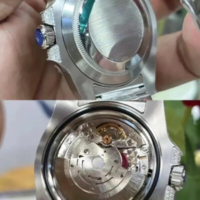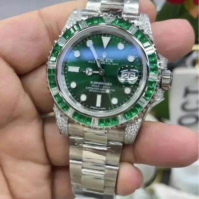 The 40 mm Oyster case radiates timeless strength and refinement. The bezel is fully gem-set with alternating emeralds and diamonds, forming a striking green-and-white halo around the black dial. Inside, the dial is paved with high-clarity diamonds, with larger baguette-cut emeralds marking the quarter-hours. Despite its lavish appearance, the watch retains the core engineering of a professional Submariner — water-resistant, precise, and built to endure.