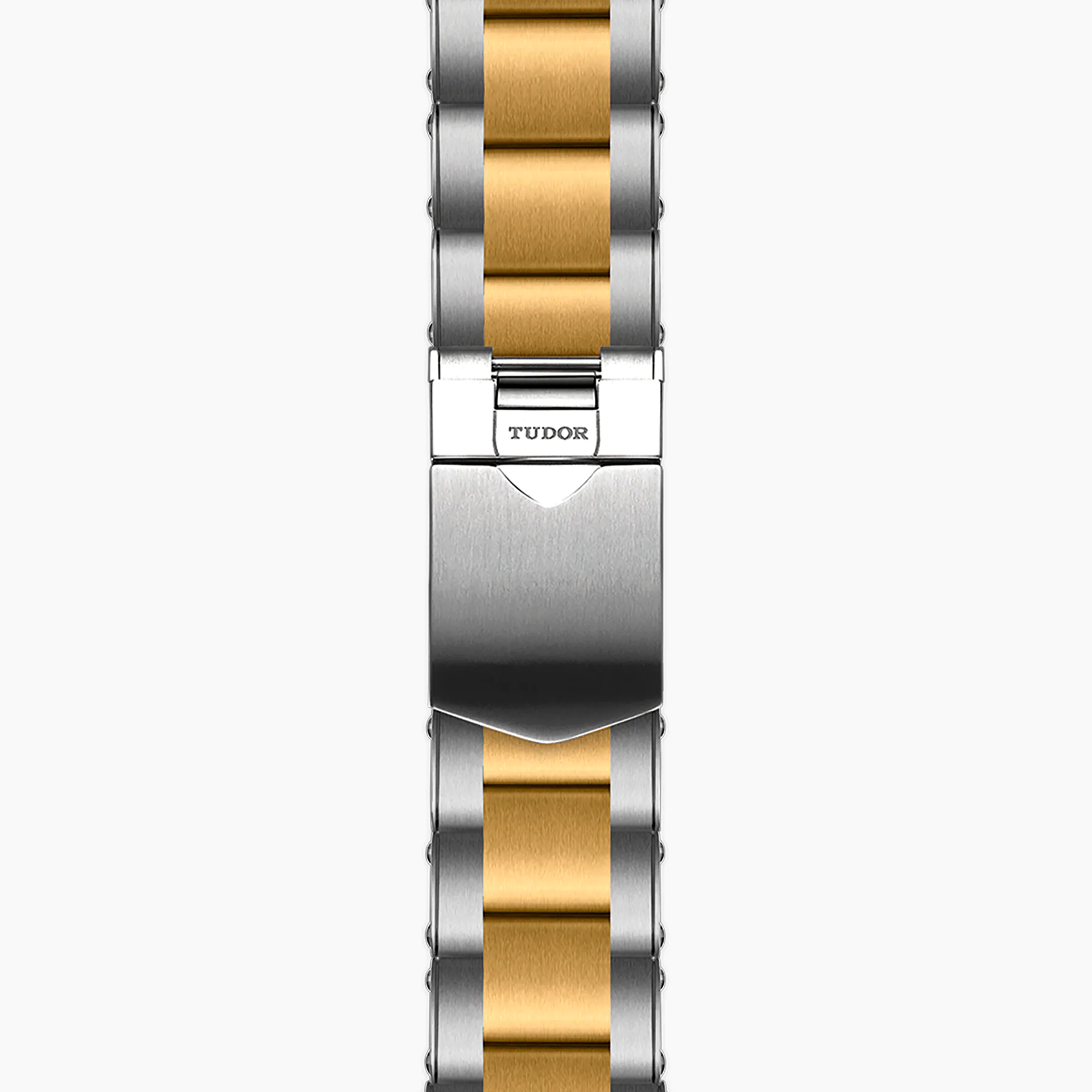 Luxury unworn watch Tudor Black Bay Chrono S&G, 41mm, brushed and polished Stainless Steel and 18k Yellow Gold Ref# M79363N-0007. This sporty chic TUDOR model with a sophisticated look is at the top of the fashion Olympus, harmoniously combining bright elements and high functionality. An incredibly beautiful, well-read multiimpressive domed Champagne-colour dial is a feature of this model. It is decorated with luminescent large round applied Gold toned hour markers, as well as a luminous triangle at 12 o’clock. On the outer perimeter of the dial, there is a black minute-second scale. Date display at the 6 o’clock position. The chronograph includes two black sub-dials: Small second hand sub-dial at 60 seconds located at the 9 o’clock position and the sub-dial at 45 minutes at the 3 o’clock position. Spectacular completion of an amazing picture – 18k Yellow Gold arrows with a luminous fill. The hour hand feature the distinctive angular tips known to collectors as the “Snowflake”, and the second is highlighted with a red tip. Complementing all this charm is an 18k Yellow Gold screw-down winding crown, with the TUDOR rose. The chronograph is operated by 18k Yellow Gold screw-down pushers at 2 and 4 o’clock. The dial closed by a Domed Scratch-resistant Sapphire Crystal. The watch mechanism is sewn up by a solid case back. An elegant feature of the model is a Fixed 18k Yellow Gold bezel with tachymetric scale in matt Black anodised aluminium and 18k Rose Gold gilded markings and numerals.  The model is equipped with a manufacture Tudor Self-winding mechanical movement with bidirectional rotor system, caliber MT5813 (COSC), contains 47 jewels and has an approximate power reserve of 70 hours. This incredibly beautiful timepiece, a masterpiece of the manufacturer, is presented on a Riveted Stainless Steel and 18k Yellow Gold bracelet, polished and satin finish, with folding clasp and safety catch. Water resistant up to 200m/660ft (20 ATM).