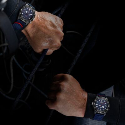 Unworn watch Tudor Pelagos FXD, 42mm, Ref# M25707KN-0001. As sponsor of last year’s Alinghi America’s Cup, Tudor introduces the Pelagos FXD, built specifically for the sailing team. Pelagos FXD features a carbon composite case – a first for Tudor – along with a functional design borrowed from FXD military diving watches. This exquisite timepiece features a charming navy blue dial composed of two main elements: a flat disc with a brushed finish and a 45° bevelled flange bearing the minute track and the Alinghi Red Bull Racing team name. The dial is decorated with a red Pelagos inscription and an elegant red second hand. Large appliqué hour markers made from a monobloc luminescent ceramic composite improve the technical aesthetics and enhance the watch’s brightness in low-light conditions, making it easy to tell the time. Square and rectangular hour markers at 3, 6 and 9 o’clock, as well as a large triangle at 12 o’clock, emphasize the sporty style of the Pelagos. A distinctive feature of watch aesthetics is the hands with luminous filling. The hour and second hands feature the distinctive angular tips known to collectors as the “Snowflake”. All this charm is complemented by a screw-down crown made of titanium, decorated with a relief image of the TUDOR shield. The dial closed by a Flat Scratch-resistant Sapphire Crystal. A one-piece black carbon composite back with a matte finish protects the watch movement. To highlight the official collaboration between Tudor and the French Navy, the caseback is engraved with the Alinghi Red Bull Racing logo. Impressive is the titanium bi-directional rotating bezel with a matte black carbon composite insert, enhanced by a special 120-click mechanism for precise and smooth operation. In addition, the bezel features an easy-to-read luminous 60-minute retrograde scale for navigating through successive stages. The model is equipped with a manufacture Tudor self-winding mechanical movement bidirectional rotor system Calibre MT5602 (COSC), contains 25 jewels and has an approximate power reserve approximately of 70 hours. This bright timepiece is presented on one-piece blue fabric strap with Velcro closures. Water resistant up to 200m/660ft (20 ATM).