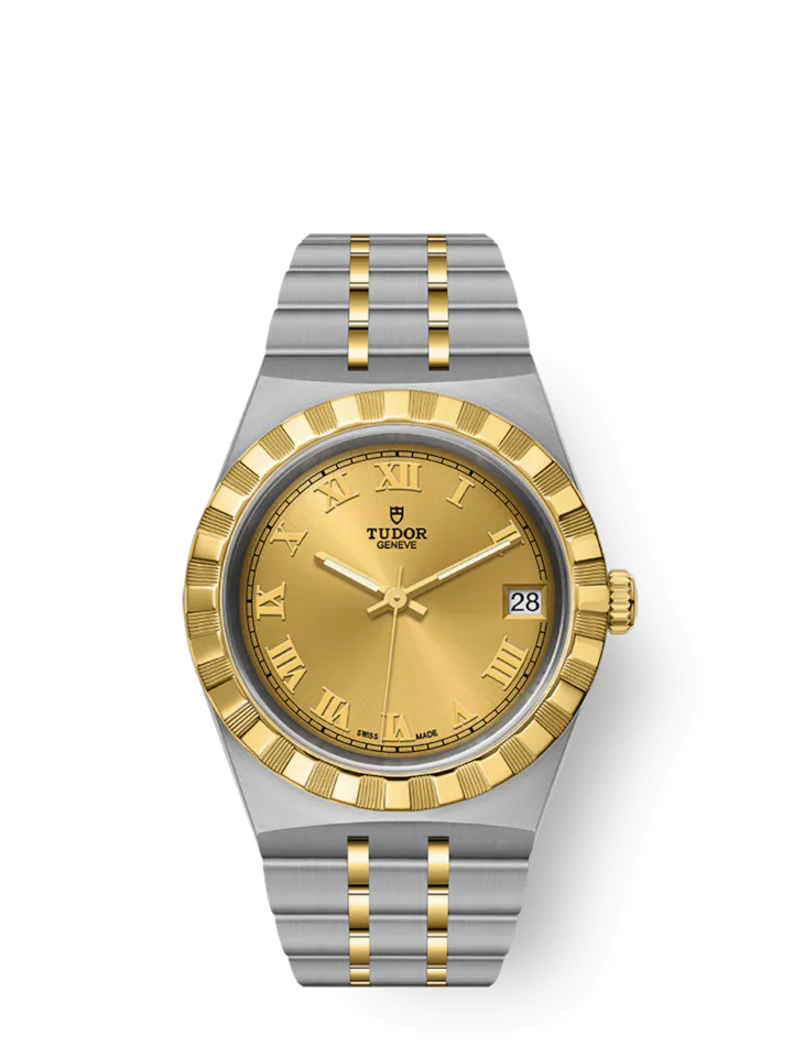 Unworn watch Tudor Royal, polished and satin finish Stainless Steel and 18k Yellow Gold, 34mm Ref# M28403-0004. TUDOR Royal is elegance and versatility in perfect balance. TUDOR Royal is a line of uncompromising watches, characterized by affordable prices, excellent quality, designed in a sport-chic style. However, thanks to their top-notch technical features and sophisticated aesthetics, the TUDOR Royal can also be classed as a classic. Emphasizing the luxurious style of the watch, the Champagne-colour dial is decorated with sunbeams emanating from the center, creating elegant lighting effects and reflections and applied Yellow Gold-tone hour markers with Roman numerals. The stylish Yellow Gold-tone hour and minute hands in the form of swords with luminous filling, as well as the elegant thin Yellow Gold-tone second hand look spectacular on it.  A well-read minute scale is applied along outer contour dial. The functionality of the watch is enhanced by the date display, which is traditionally at the 3 o’clock position. Complementing all this charm is the screw-down 18k Yellow Gold ribbed crown for a comfortable grip, bearing the TUDOR logo. The dial closed by a Scratch-resistant Sapphire Crystal and solid Stainless Steel case back. The characteristic fixed serrated 18k Yellow Gold bezel with alternating polished surfaces and grooves gives the watch a unique personality. The model is equipped with a manufacture Tudor Self-winding mechanical movement Calibre T601, contains 25/26 jewels and has an approximate power reserve approximately of 38 hours. This spectacular timepiece is presented on an Integrated bracelet in 316L Stainless Steel and 18k Yellow Gold, of five rows, satin-brushed external and central links, polished intermediate links. The Stainless Steel folding clasp and safety catch, made using own unique Tudor technologies, guarantees maximum comfort on the wrist. Water resistant up to 100m/330ft (10 ATM).