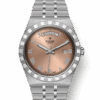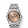 Unworn watch Tudor Royal, polished and satin finish Stainless Steel with Diamond-set, 28mm Ref# M28300-0010. Paying tribute to the past, TUDOR looks to the future with enthusiasm, improving its skills and creating new interesting models of its watches. So new for 2023 in the TUDOR Royal line are models with interesting dial options: chocolate brown and salmon. Emphasizing the luxurious style of the watch, the Salmon dial is decorated with sunbeams emanating from the center, creating elegant lighting effects and reflections. Applied Silver-tone hour markers with Roman numerals complement it at 3, 6, 9 and 12 o’clock positions, as well as hour markers set with 8 brilliant-cut diamonds. The stylish Silver-tone hour and minute hands in the form of swords with luminous filling, as well as the elegant thin Silver-tone second hand look spectacular on it. A well-read minute scale is applied along outer contour dial. The functionality of the watch is enhanced by the date display, which is traditionally at the 3 o’clock position. Complementing all this charm is the screw-down 316L Stainless Steel ribbed crown for a comfortable grip, bearing the TUDOR logo. The dial closed by a Scratch-resistant Sapphire Crystal and solid Stainless Steel case back. The characteristic fixed serrated 316L Stainless Steel bezel with alternating polished surfaces and grooves gives the watch a unique personality. The model is equipped with a manufacture Tudor Self-winding mechanical movement Calibre T201, contains 25 jewels and has an approximate power reserve approximately of 38 hours. This spectacular timepiece is presented on an Integrated bracelet in 316L Stainless Steel 316L Stainless Steel of five rows, satin-brushed external and central links, polished intermediate links. The Stainless Steel folding clasp and safety catch, made using own unique Tudor technologies, guarantees maximum comfort on the wrist. Water resistant up to 100m/330ft (10 ATM).