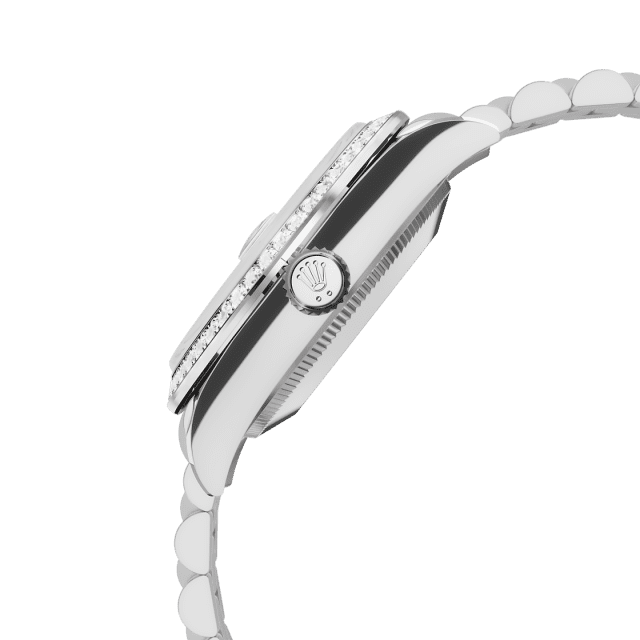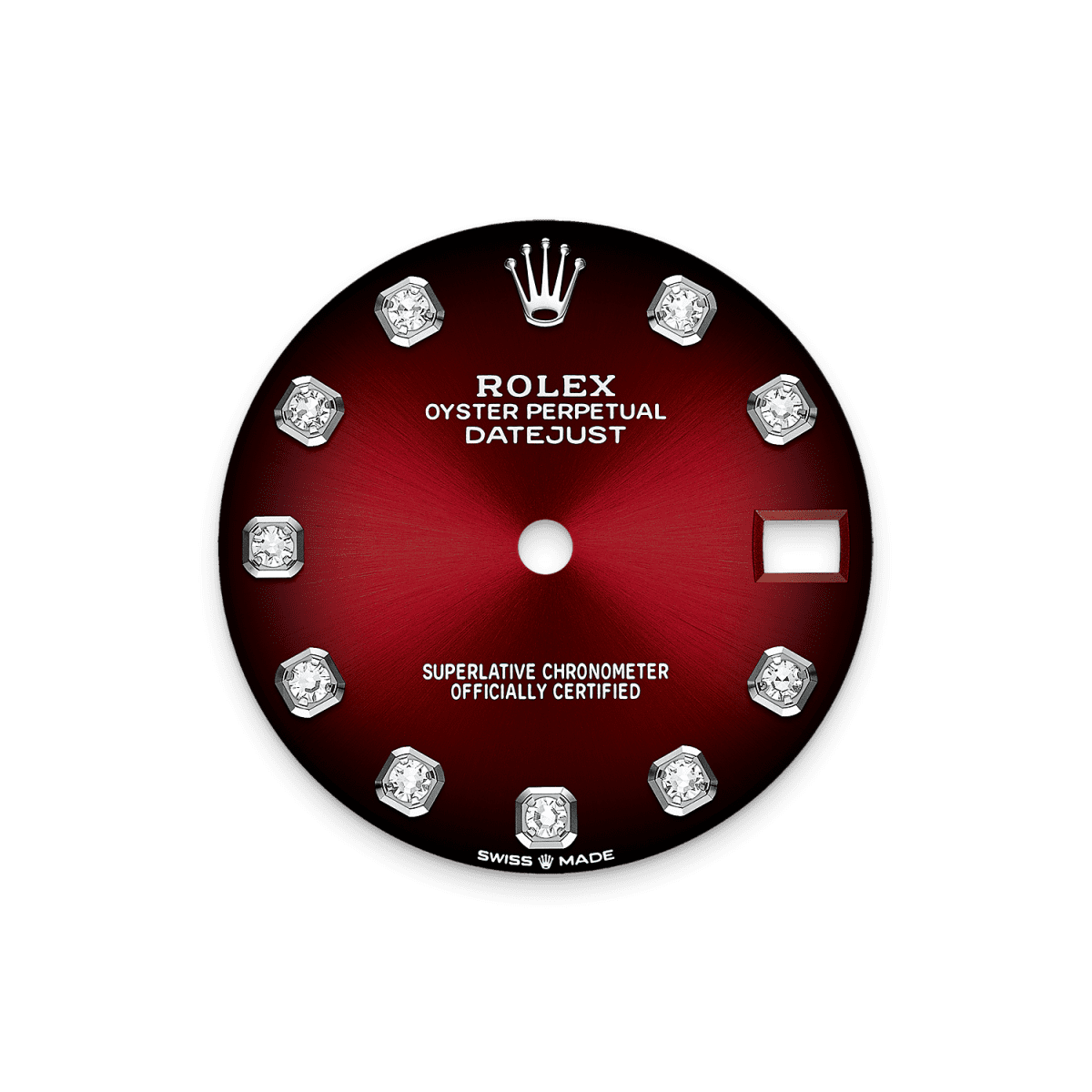 Introducing unworn classic Rolex Datejust 31 watch, Reference 278289rbr-0028a masterful blend of elegance and precision, showcasing Rolex’s commitment to timeless design and exceptional craftsmanship. Crafted from 18k White Gold, the 31mm Oyster case exudes a warm, luxurious glow. This iconic model has red ombré dial, transitioning from a vibrant center to a deep black edge, is set with diamonds, creating a captivating visual effect. This design pays homage to a style Rolex introduced in the 1980s and reintroduced in 2019, involving a delicate application of black lacquer to achieve the gradient effect. At the heart of its design, the dial proudly displays an applied 18k White Gold Rolex Crown at 12 o’clock, accompanied by traditionally polished 18k White Gold hands that glide with effortless precision. The iconic Cyclops lens, ensuring superior readability, magnifies the signature date window at 3 o’clock. Special attention is given to the screw-down crown, crafted from 18k White Gold and finished with a ribbed edge for secure handling. Embellished with the Rolex emblem on its tip, it incorporates the Twinlock double waterproofness system, ensuring reliable resistance to moisture and dust. Protecting the dial is a scratch-resistant sapphire crystal, seamlessly paired with a solid case back for enhanced durability. Framing the dial is a fixed, bezel in 18k White Gold artfully set with 46 flawless round brilliant diamonds, embodying the watch’s refined aesthetic. Powering this piece is the in-house Rolex Caliber 2236 — a self-winding mechanical movement boasting 31 jewels and a 55-hour power reserve. Engineered with Rolex’s patented Chronergy escapement and Parachrom hairspring, this movement ensures unmatched precision, resilience to shocks and magnetic fields, and outstanding performance. The timepiece is fitted with the iconic 18k White Gold President bracelet, characterized by its semi-circular three-piece links, providing both comfort and a distinguished aesthetic. The bracelet’s concealed Crownclasp ensures seamless integration with the case, maintaining the watch’s elegant profile. The water resistance is up to 100m/330ft (10 ATM).