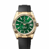 Introducing unworn Rolex Sky-Dweller watch, Ref# 336938-0007 is a masterful blend of sophisticated engineering and luxurious design, tailored for the global traveler. New 2025, from 18k Yellow Gold with 42 mm Oyster case timepiece features a vibrant bright green dial. The dial’s Chromalight display ensures legibility in low-light conditions, with rectangular index hour markers and longer hands emitting a long-lasting blue luminescence. A fixed inverted red triangle points to the chosen reference time on the 24-hour disc, and a deep red rectangle in one of the 12 apertures around the dial indicates the current month, enhancing the watch’s intuitive readability. At the heart of the Sky-Dweller lies, the Rolex Calibre 9002 contains 40 jewels and has an approximate power reserve of approximately 72 hours powers, a self-winding mechanical movement that offers dual time zone functionality and an annual calendar. The off-center 24-hour disc allows for easy reading of home time, while the central hands display local time. The Saros annual calendar automatically differentiates between 30- and 31-day months, requiring only one date adjustment per year, at the end of February. The fluted bezel in 18k Yellow Gold is a true hallmark of Rolex. Bidirectional rotatable, it is part of the Ring Command system and, when interacting with the crown, allows the user to select watch functions one by one and adjust them easily, quickly and simply. Completing the timepiece is the 18k Yellow Gold Oyster, three-piece solid links bracelet, known for its comfort and elegance, featuring five-piece links and equipped with an 18k Yellow Gold folding Oysterclasp and Easylink 5 mm comfort extension link for optimal fit. The Sky-Dweller is waterproof to 100 meters (330 feet), ensuring durability alongside its refined aesthetics.