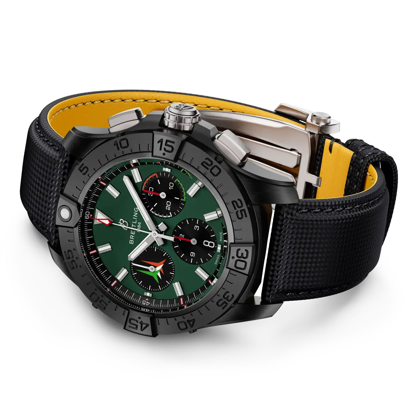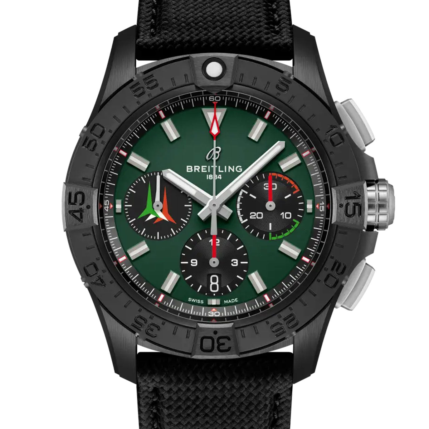 The Breitling Avenger B01 Chronograph 42 is a bold and tactical timepiece built for performance in the most extreme conditions. This edition features a lightweight yet ultra-durable black ceramic case paired with a rugged military green dial and matching textile strap. Powered by the COSC-certified Breitling Manufacture Caliber 01, the watch delivers precise chronograph functionality, a 70-hour power reserve, and a column-wheel mechanism—all visible through the sapphire caseback. With its screw-down crown, high-contrast dial, and unidirectional ratcheted bezel, this Avenger is engineered for both air and ground missions. A blend of resilience, accuracy, and striking design, it’s made for those who demand excellence from their equipment.