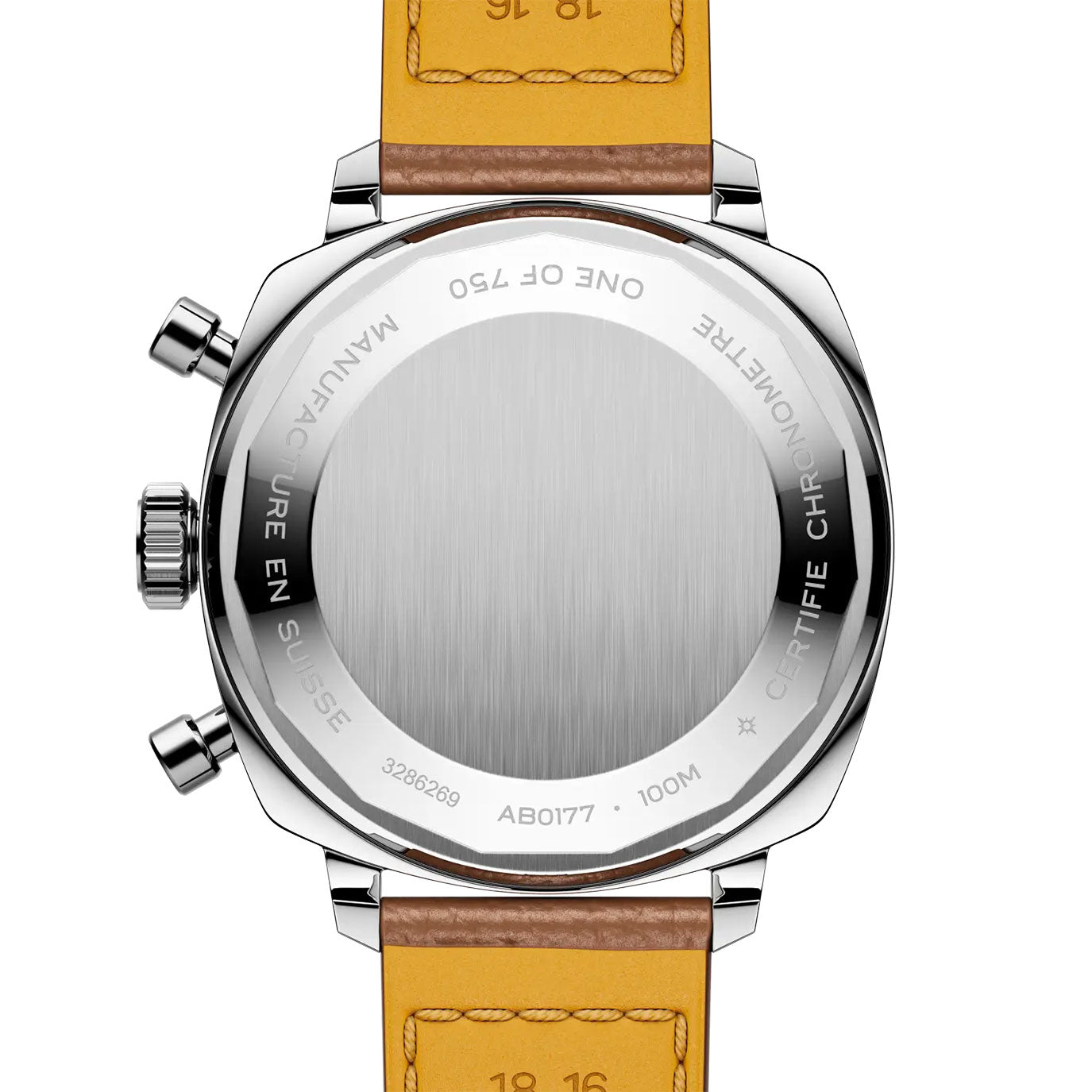 A modern revival of Breitling’s 1960s racing chronograph, the Top Time B01 38 mm captures vintage sportiness with contemporary mechanical excellence. This edition features a compact 38 mm stainless steel case housing the in-house Breitling Manufacture Caliber 01, offering top-tier chronograph functionality with a 70-hour power reserve. The black dial with its classic bi-compax layout is inspired by motorsport heritage, enhanced by the tachymeter scale and red chronograph accents. With a cambered sapphire crystal and 100 m water resistance, this timepiece delivers everyday durability. The straight-cut beige calfskin strap with stainless steel tang buckle completes the watch’s retro-modern aesthetic, making it a versatile companion for those who appreciate both history and high performance.