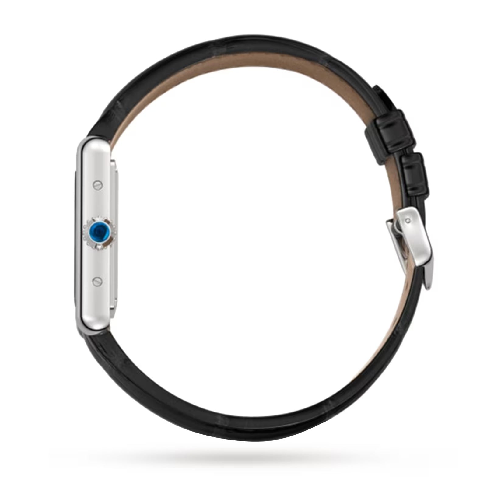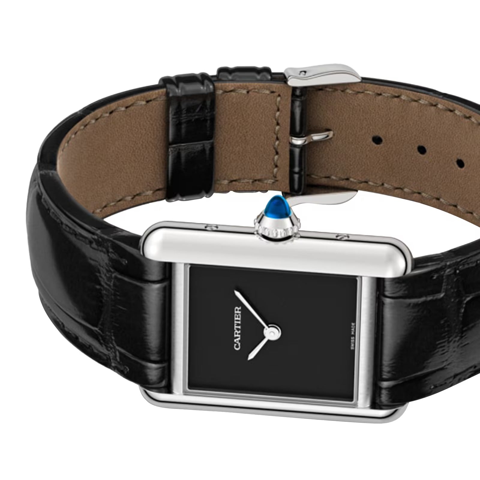 The Cartier Tank Must de Cartier Watch Ref# WSTA0071 embodies the brand’s commitment to timeless elegance and minimalist design. Drawing inspiration from the original Tank watch introduced in 1917, this model maintains the iconic rectangular silhouette and clean lines that have become synonymous with Cartier’s watchmaking heritage. Constructed from polished stainless steel, the case measures 29.5mm x 22mm with a thickness of 6.6 mm, offering a balanced presence on the wrist. This model is part of Cartier’s Tank Must collection, which reimagines the classic Tank design with modern updates while maintaining its iconic features. The black lacquered dial, which has no numerals or markers, creates a striking contrast with the silver-tone rhodium-plated steel sword-shaped hands, enhancing legibility while maintaining an elegant appearance, highlighting the purity of form and functionality. A beaded crown set with a blue synthetic cabochon-shaped spinel adds a touch of sophistication, a signature detail in Cartier’s design language. Powered by a high-autonomy quartz movement, the watch offers reliable timekeeping with minimal maintenance. The watch is paired with a shiny black alligator leather strap, secured by a stainless steel ardillon buckle, ensuring both comfort and style. With a water resistance of up to 3 bar (approximately 30 meters/100 feet), it is suitable for everyday wear. The Tank Must de Cartier WSTA0071 is more than a timepiece — it’s a bold statement of style and heritage, designed for those who appreciate timeless design and uncompromising quality.