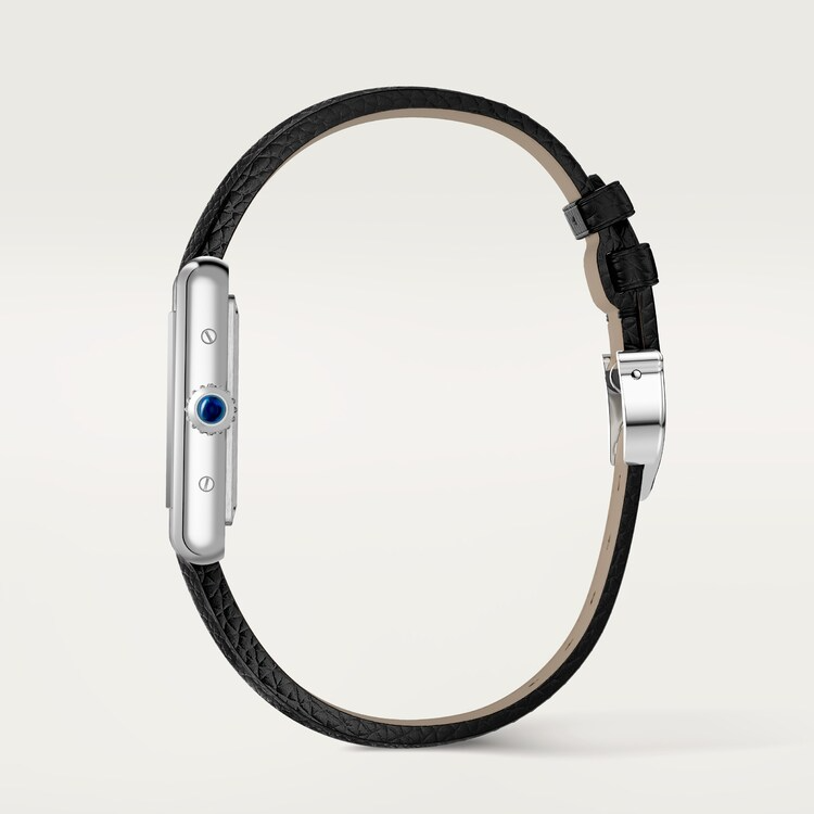 Introducing unworn Small watch, the Cartier Tank Must SolarBeat™ de Cartier Ref# WSTA0060 embodies the brand’s commitment to timeless elegance and minimalist design. Drawing inspiration from the original Tank watch introduced in 1917, this model maintains the iconic rectangular silhouette and clean lines that have become synonymous with Cartier’s watchmaking heritage. Constructed from polished stainless steel, the case measures 29.5mm x 22mm with a thickness of 6.6 mm, offering a balanced presence on the wrist. This model is part of Cartier’s Tank Must collection, which reimagines the classic Tank design with modern updates while maintaining its iconic features. The Silvered dial with Black printed Roman numeral hour markers complemented by blued-steel sword-shaped hands. In the center is a finely printed black minute/seconds scale with bright markers every five minutes, adding charm and practical functionality. A beaded crown set with a blue synthetic cabochon-shaped spinel adds a touch of sophistication, a signature detail in Cartier’s design language. Powered by a high-autonomy Photovoltaic Solar Beat™ movement, the watch offers reliable timekeeping with minimal maintenance. The watch is paired with an interchangeable black grained calfskin strap, secured by a stainless steel ardillon buckle, ensuring both comfort and style. Finished with a scratch-resistant sapphire crystal, solid case back, and rated water-resistant up to 30 meters (100 feet), the Santos WSTA0060 is a sophisticated companion built for both everyday wear and formal occasions.