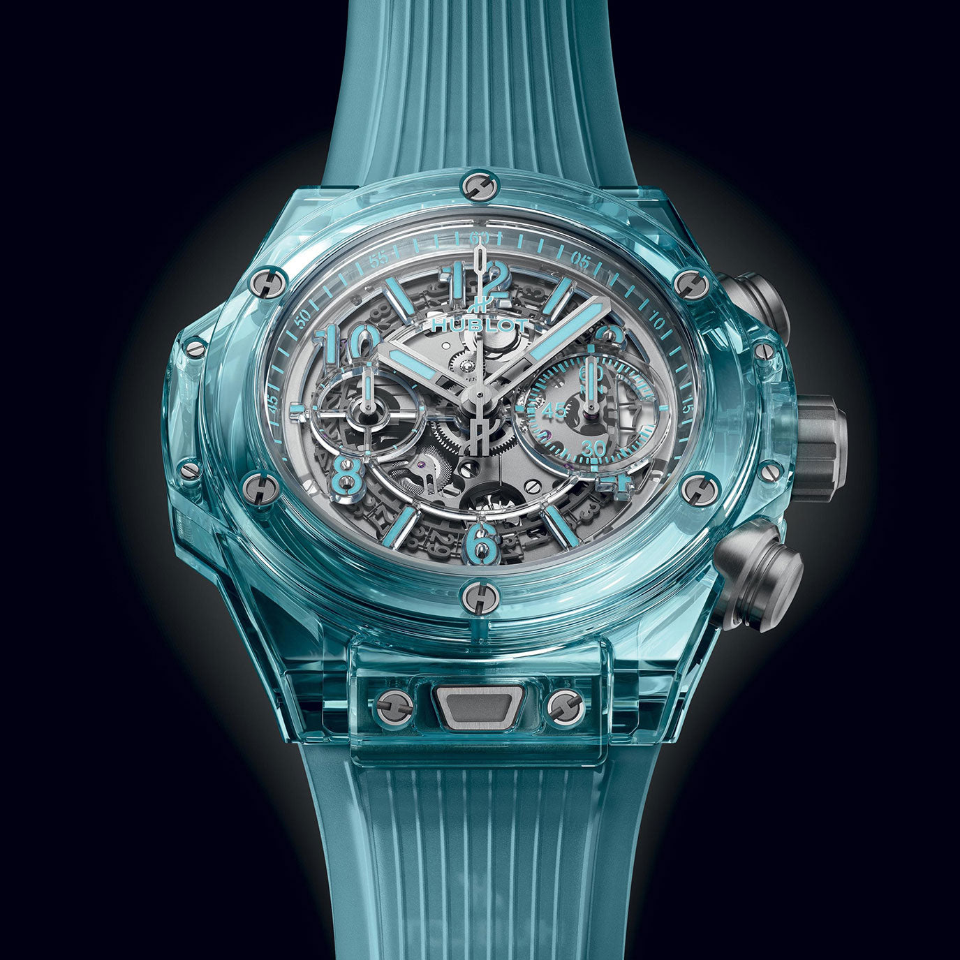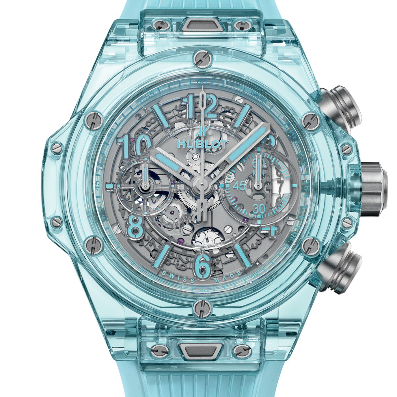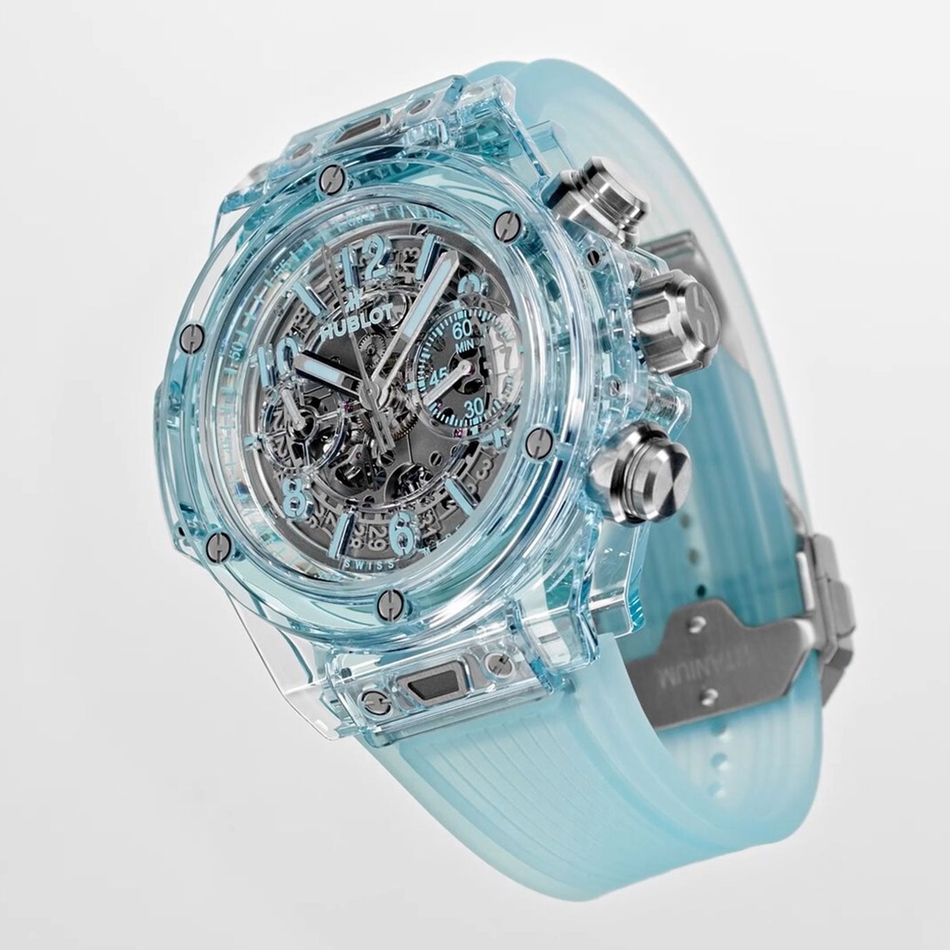 The Hublot Big Bang Unico Water Blue Sapphire 44 mm is a stunning example of innovation and artistry, showcasing the brand’s mastery in sculpting sapphire crystal into a bold and futuristic timepiece. The transparent blue case is crafted entirely from polished water blue sapphire, offering both durability and a uniquely luminous aesthetic. Through the openworked dial, you can admire the in-house HUB1280 Unico movement—an automatic flyback chronograph with column wheel and a 72-hour power reserve. This watch pairs cutting-edge horology with modern sculpture, all completed with a matching transparent blue structured rubber strap for a sleek, high-tech look.