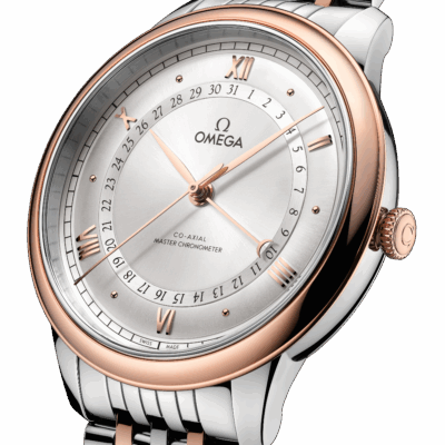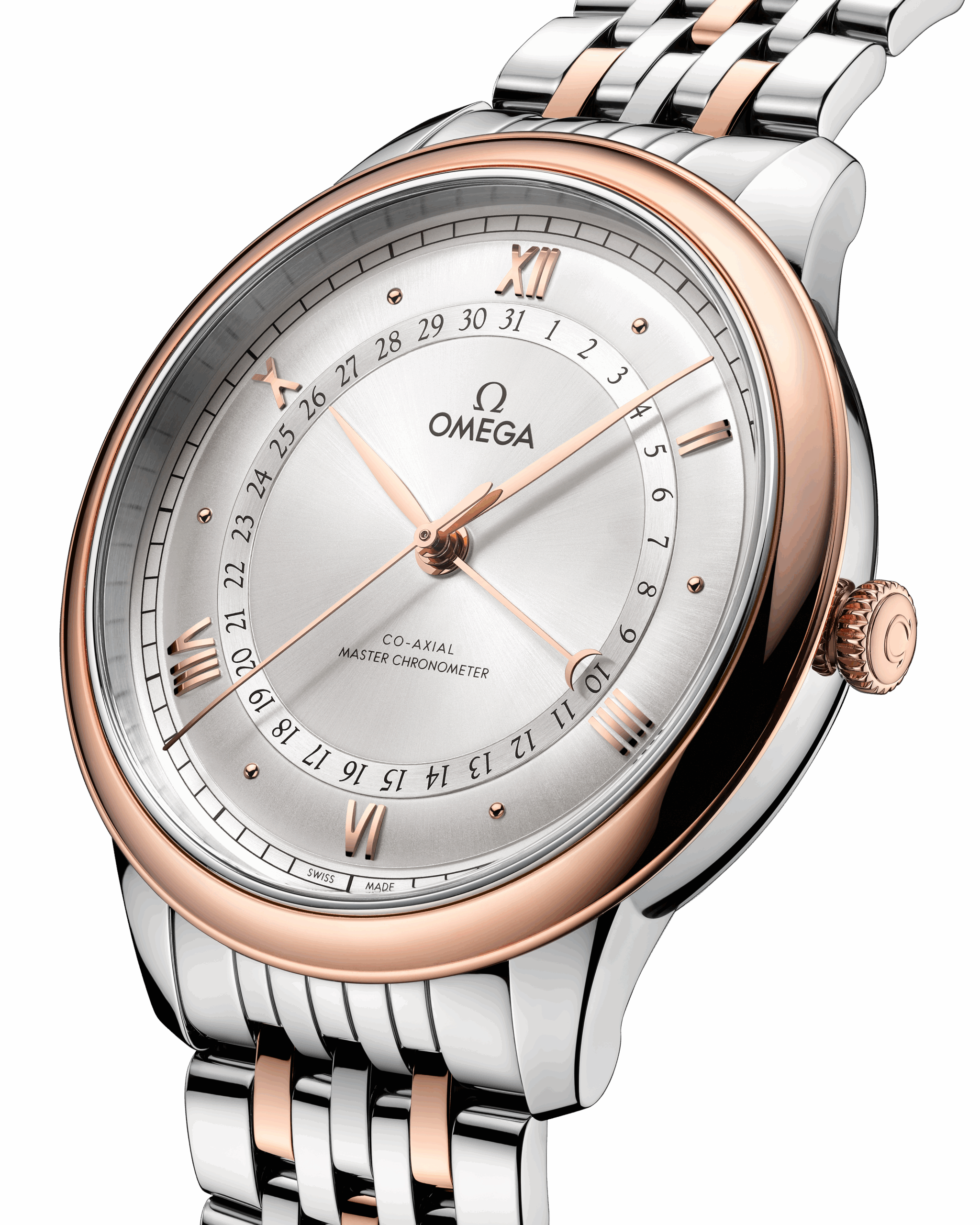 Introducing a stunning unworn De Ville Prestige Ref# 434.20.42.22.02.001 that remains the epitome of elegance and classic style in the OMEGA watch world. This exquisite 42mm model is crafted from stainless steel and luxurious 18k Sedna™ Gold, adding a warm, refined shine to the look. The opaline silver dial is domed and features a refined railway-style minute track around the outer circle. The hour markers elegantly alternate between classic Roman numerals and cabochons, adding a special charm to the dial. The central date ring with a satin-finish is particularly noteworthy. The delicate crescent-shaped hand with a PVD coating in Sedna™ gold stands out, indicating the current date on dark grey Arabic numerals. Domed scratch‑resistant sapphire crystal with anti‑reflective treatment inside ensures exceptional durability, preserving the pristine appearance of the dial. At the heart of this masterpiece is the Omega Co-Axial Master Chronometer caliber 8936, beating at 25,200 vibrations per hour, with 39 jewels and a 60-hour power reserve, which can be admired through the sapphire crystal on the caseback. The model is presented on a stylish bracelet made of Stainless Steel and 18k Sedna™ Gold, reliable and comfortable thanks to the Butterfly Clasp. Water resistance up to a 3 bar (30 metres / 100 feet).