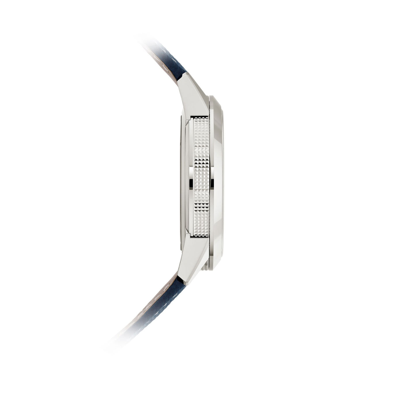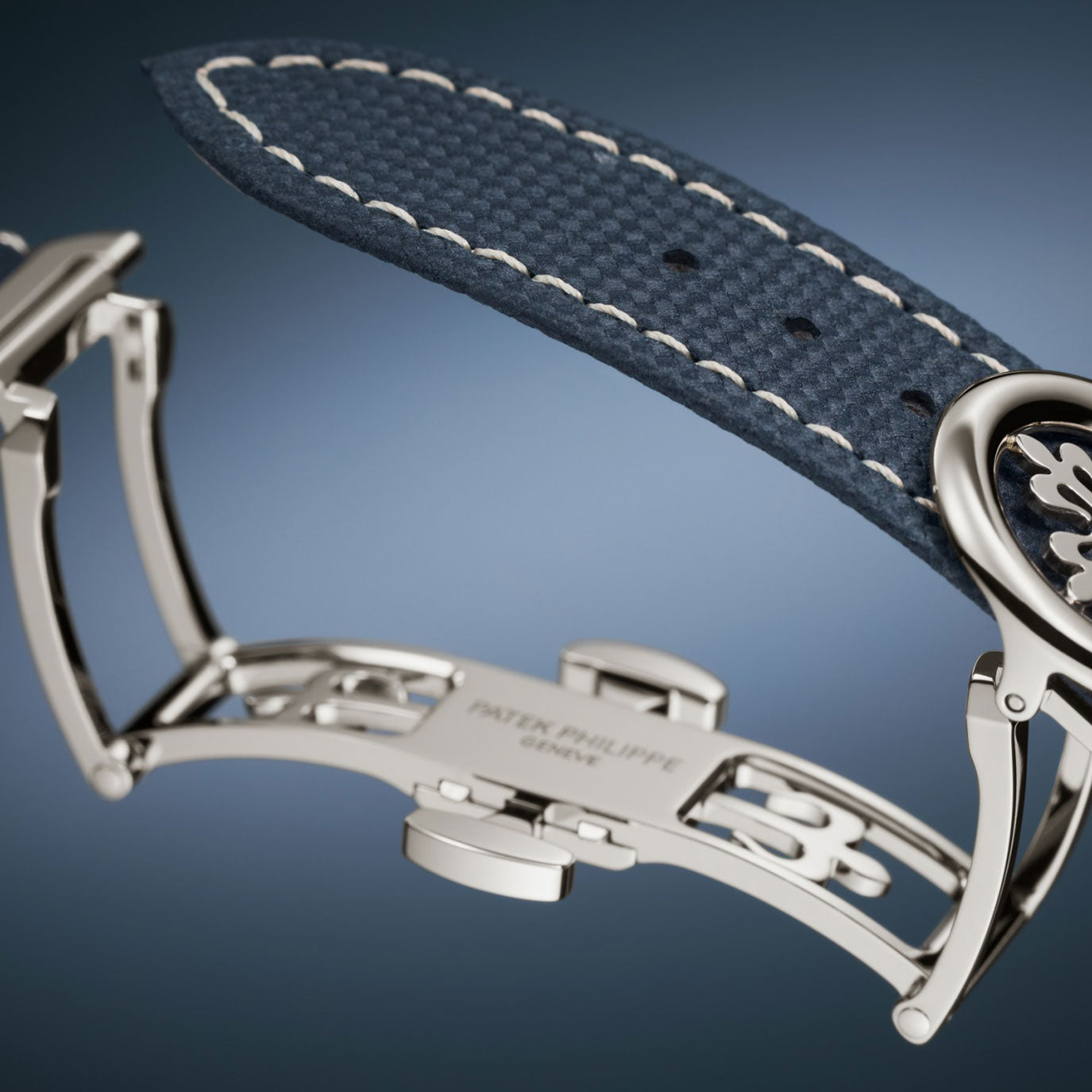 Patek Philippe unveils a new era of Complications with the Ref. 5328G-001, combining traditional elegance with advanced horology. This model introduces the manually wound Caliber 31‑505 8J PS IRM CI J, offering an extraordinary eight-day power reserve and instantaneous jumping day and date displays. The textured blue dial with a black-gradient rim features applied white gold numerals filled with luminescent coating for superb legibility. A small seconds counter and power reserve indicator complete the dial’s refined symmetry. The white gold case is adorned with a signature hobnail guilloché motif along the caseband, adding Patek Philippe’s hallmark sophistication to a watch that bridges technical innovation with timeless design.