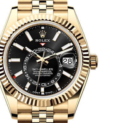 Introducing the Rolex Sky-Dweller, an epitome of elegance and innovation in horology. This stunning timepiece features a 42mm 18K yellow gold case, beautifully complemented by a bright black dial. The dial is adorned with Chromalight display for enhanced legibility and an off-center disc for dual time zone functionality. The iconic fluted bezel adds a classic touch, while the scratch-resistant sapphire crystal ensures durability. Powered by the Rolex Caliber 9002, this watch boasts a remarkable 72-hour power reserve and is water-resistant up to 100 meters. The 18K yellow gold Jubilee bracelet with an Oysterclasp and Easylink comfort extension link guarantees a secure and comfortable fit. Offered in unworn condition, this Sky-Dweller comes as a full set with the original Rolex box, booklets, and a Rolex warranty card dated 2024. Secure this exceptional timepiece today and experience the blend of cutting-edge technology and timeless elegance. Perfect for any collection, the Rolex Sky-Dweller is ready to accompany you on any journey, whether for business or leisure.